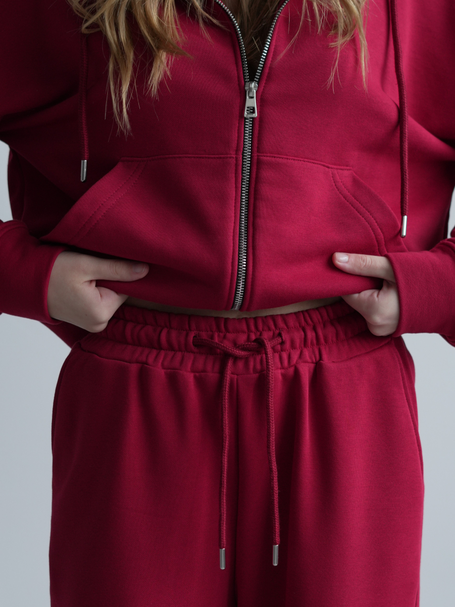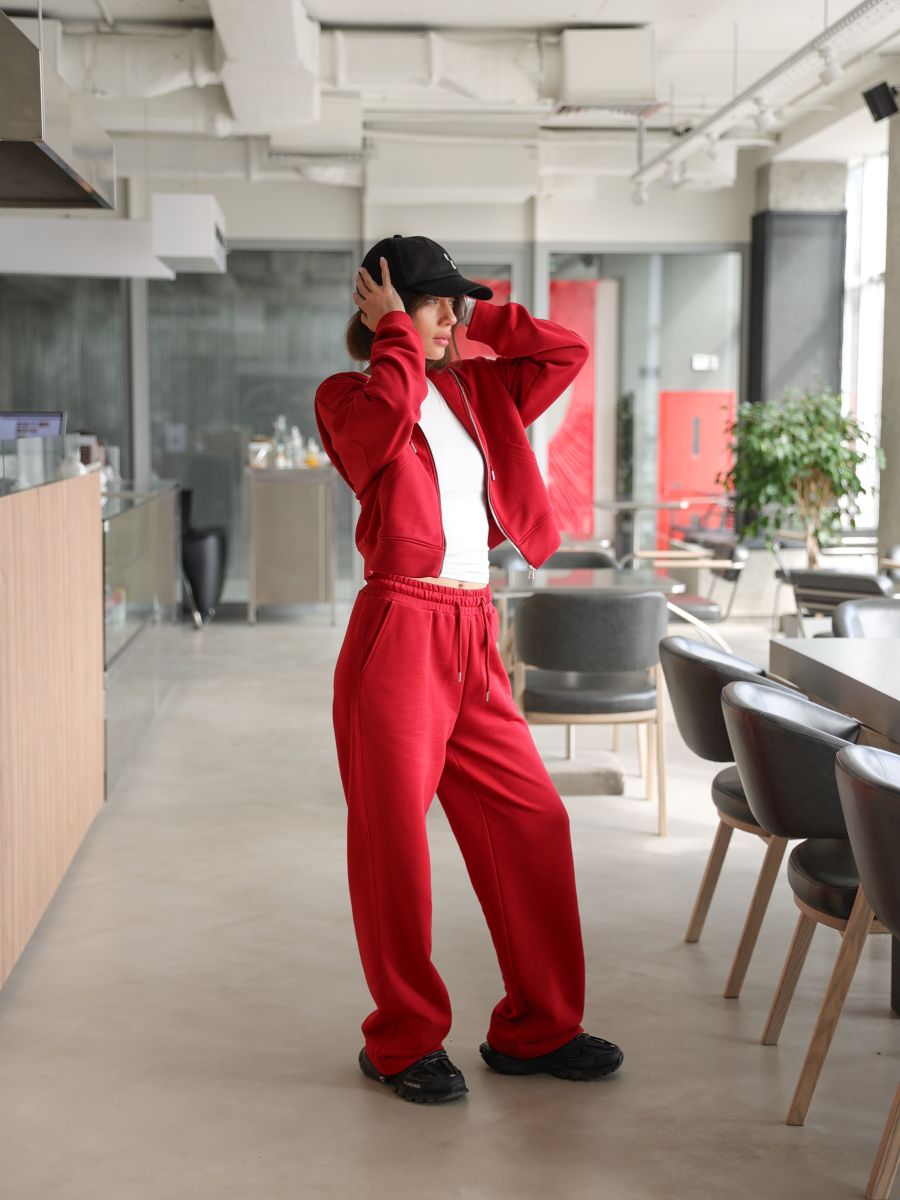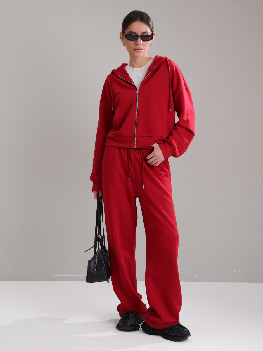 Жіночий костюм у повсякденному стилі - ідеальний баланс комфорту та трендовості. Худі з капюшоном доповнене шнурками. Прямі штани з затяжками можна трансформувати: залишити як прямі штани або стягнути затяжки та створити ефект джогерів.