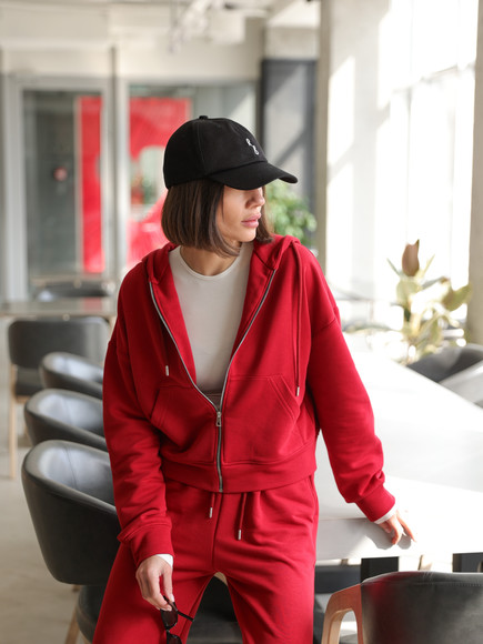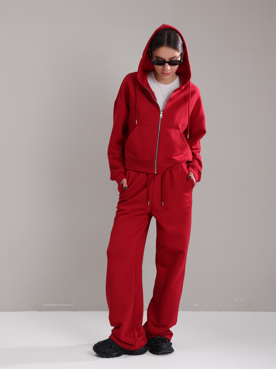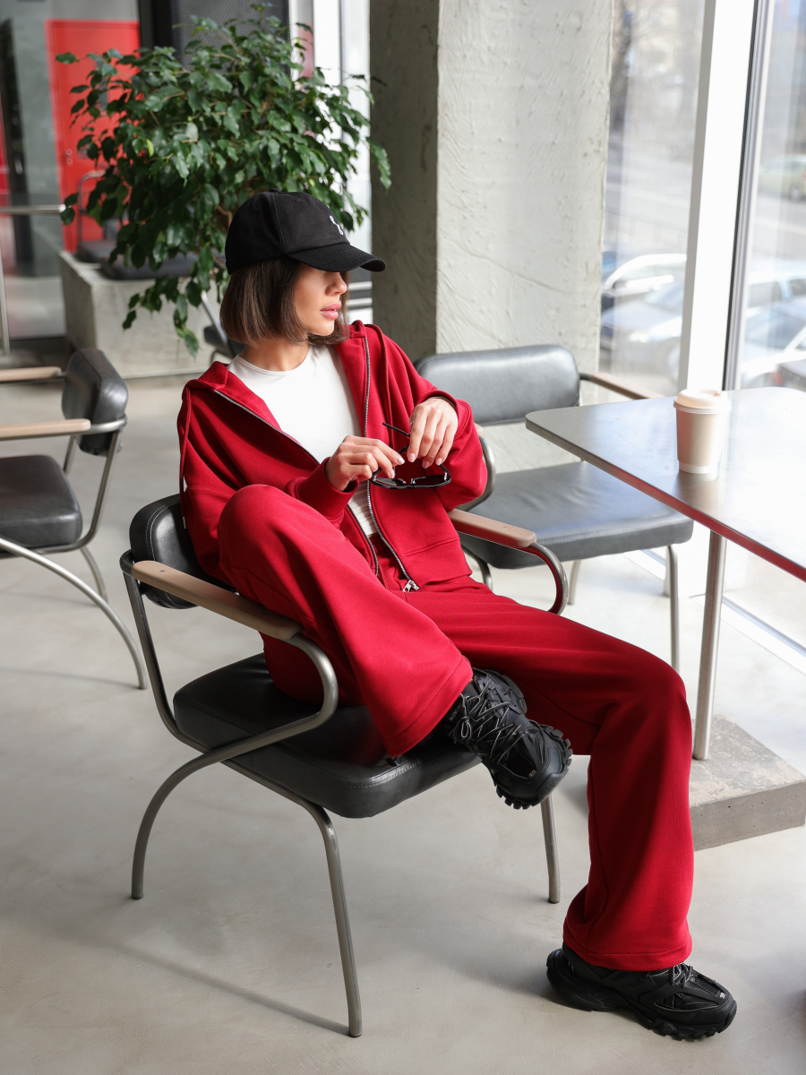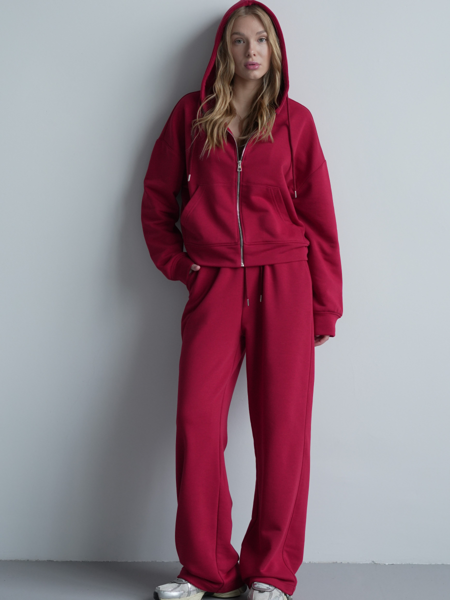 Жіночий костюм у повсякденному стилі - ідеальний баланс комфорту та трендовості. Худі з капюшоном доповнене шнурками. Прямі штани з затяжками можна трансформувати: залишити як прямі штани або стягнути затяжки та створити ефект джогерів.
