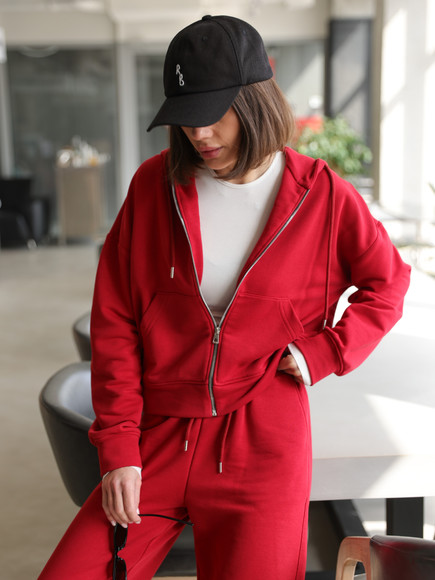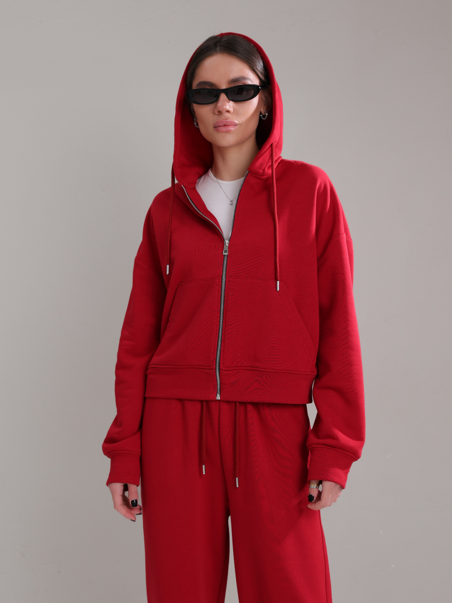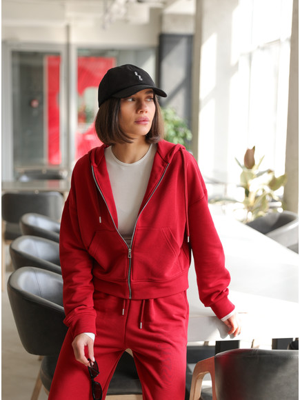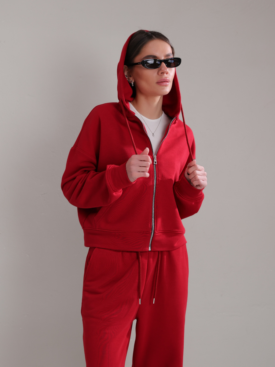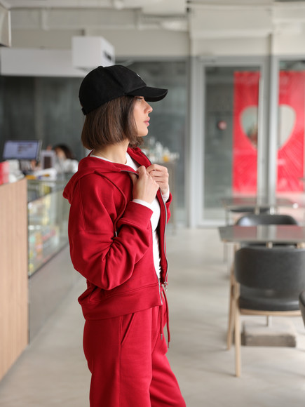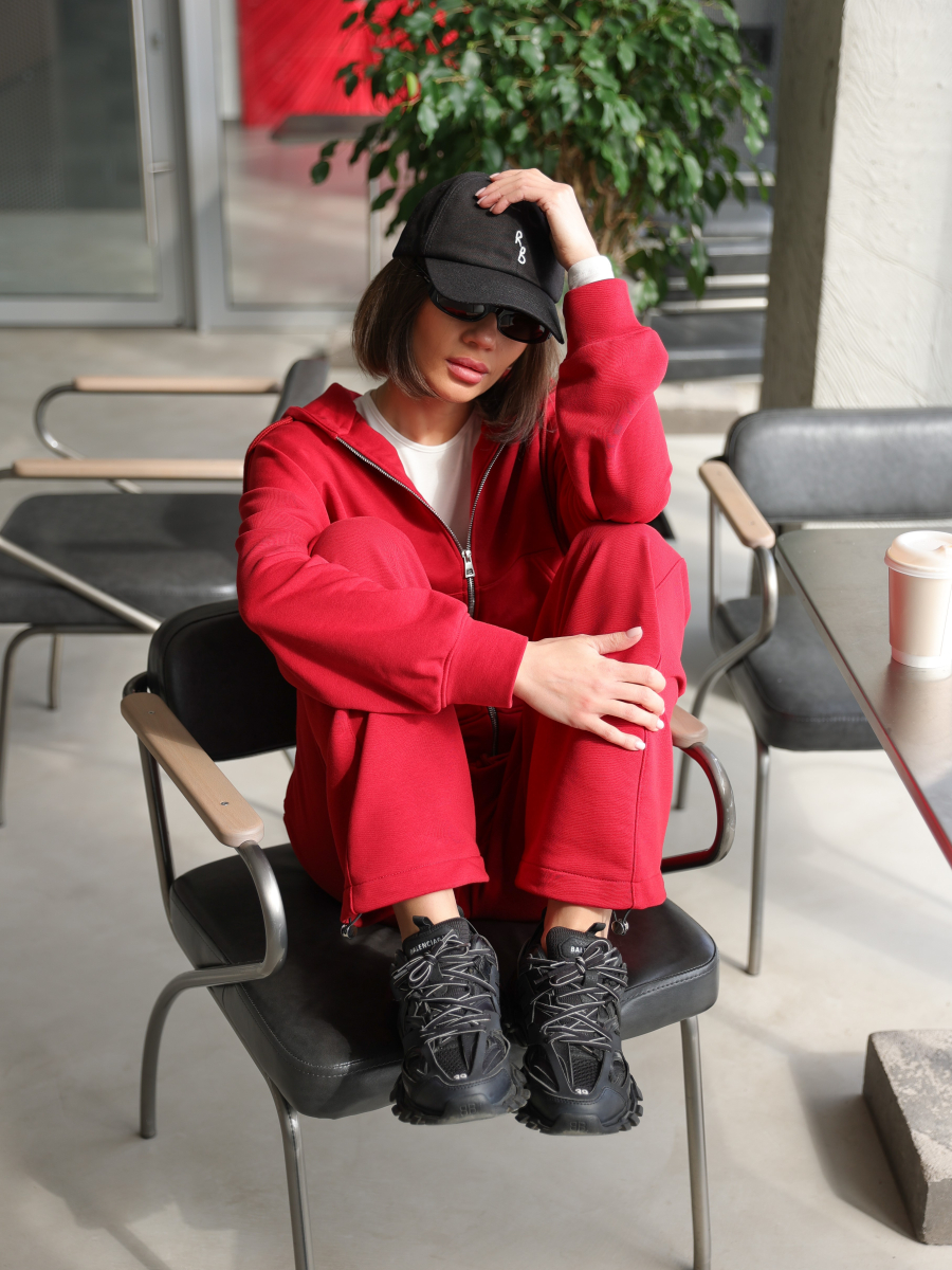 Жіночий костюм у повсякденному стилі - ідеальний баланс комфорту та трендовості. Худі з капюшоном доповнене шнурками. Прямі штани з затяжками можна трансформувати: залишити як прямі штани або стягнути затяжки та створити ефект джогерів.