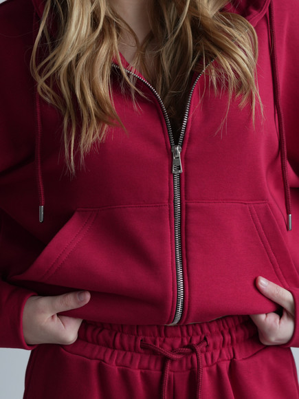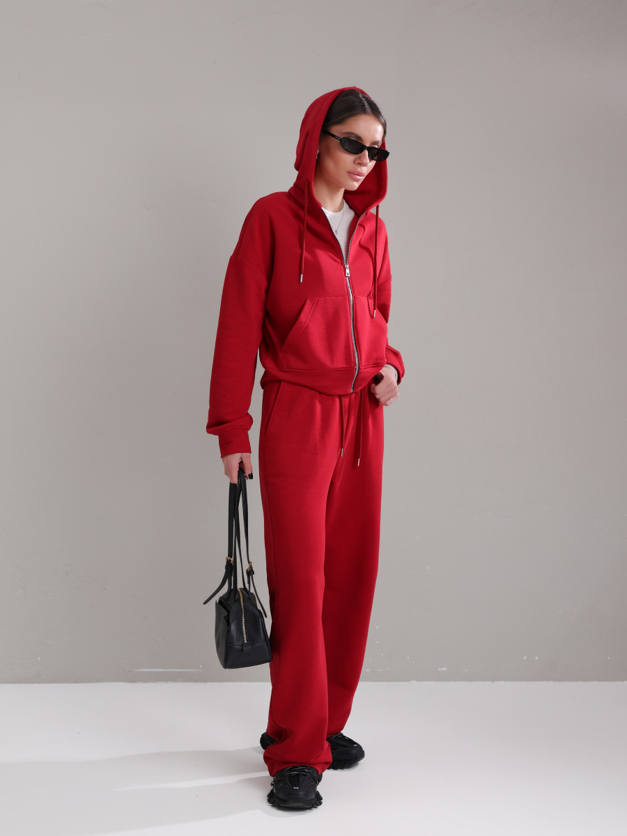 Жіночий костюм у повсякденному стилі - ідеальний баланс комфорту та трендовості. Худі з капюшоном доповнене шнурками. Прямі штани з затяжками можна трансформувати: залишити як прямі штани або стягнути затяжки та створити ефект джогерів.