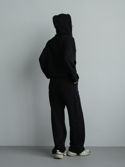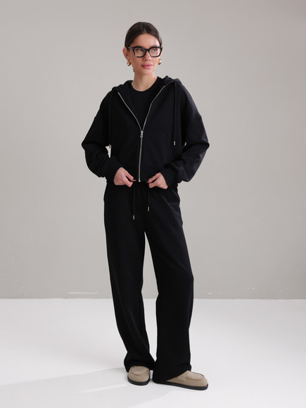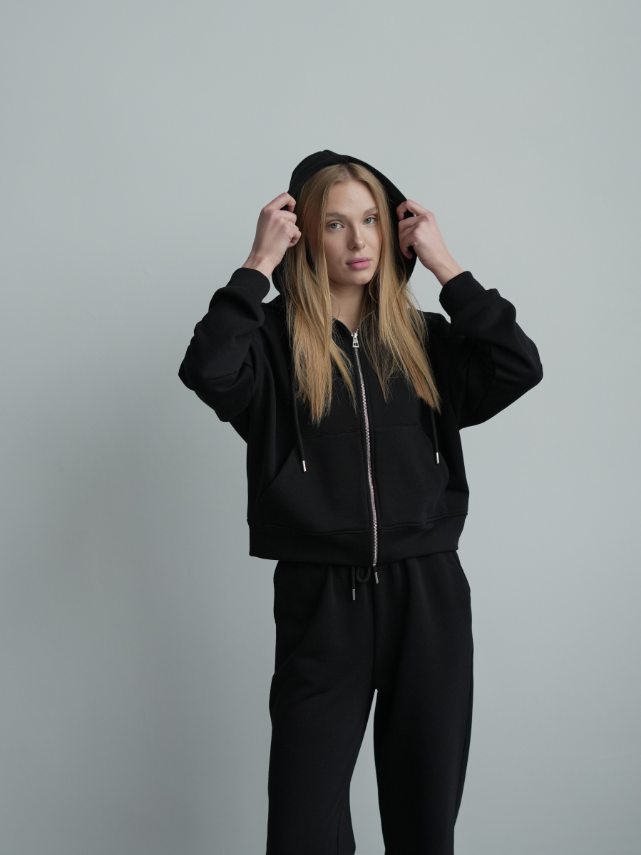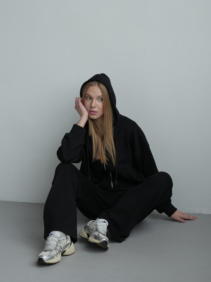 Жіночий костюм у повсякденному стилі - ідеальний баланс комфорту та трендовості. Худі з капюшоном доповнене шнурками. Прямі штани з затяжками можна трансформувати: залишити як прямі штани або стягнути затяжки та створити ефект джогерів.