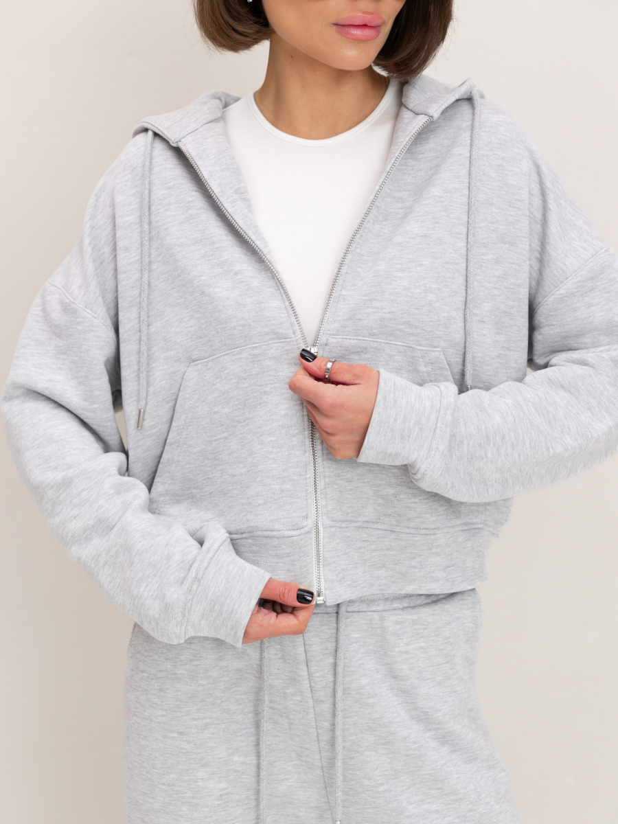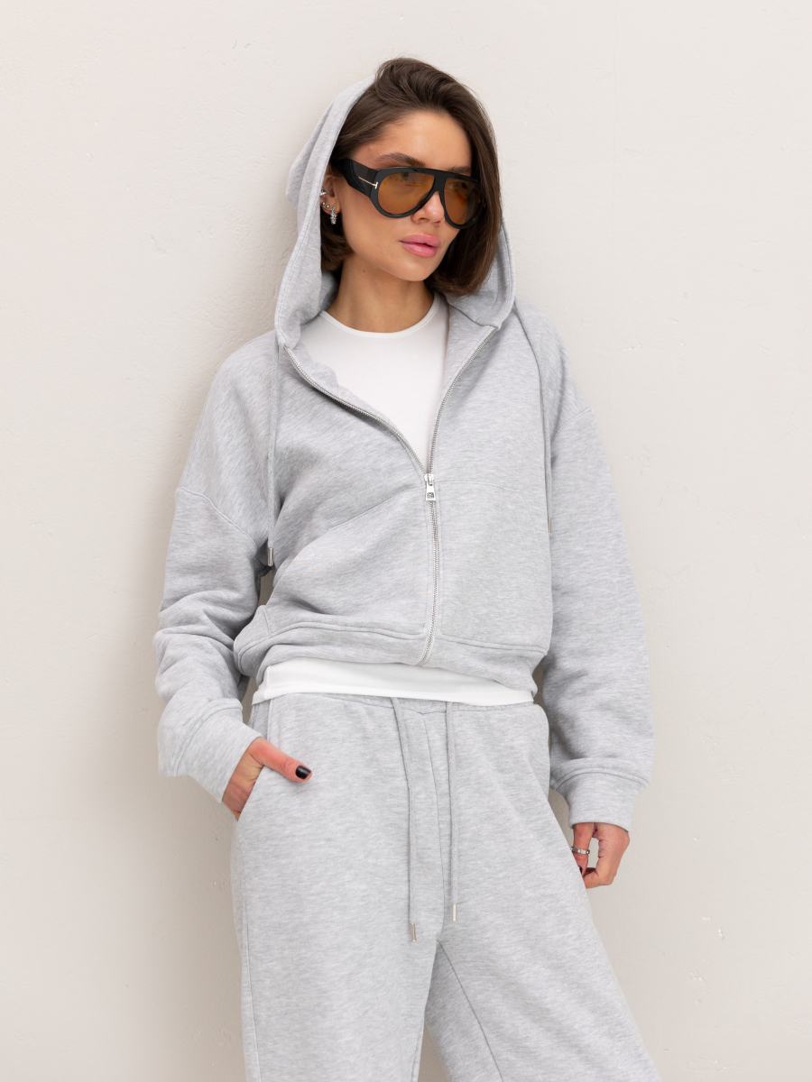 Жіночий костюм у повсякденному стилі - ідеальний баланс комфорту та трендовості. Худі з капюшоном доповнене шнурками. Прямі штани з затяжками можна трансформувати: залишити як прямі штани або стягнути затяжки та створити ефект джогерів.