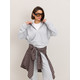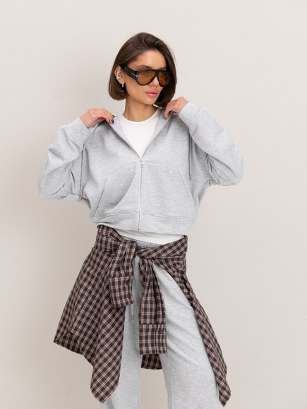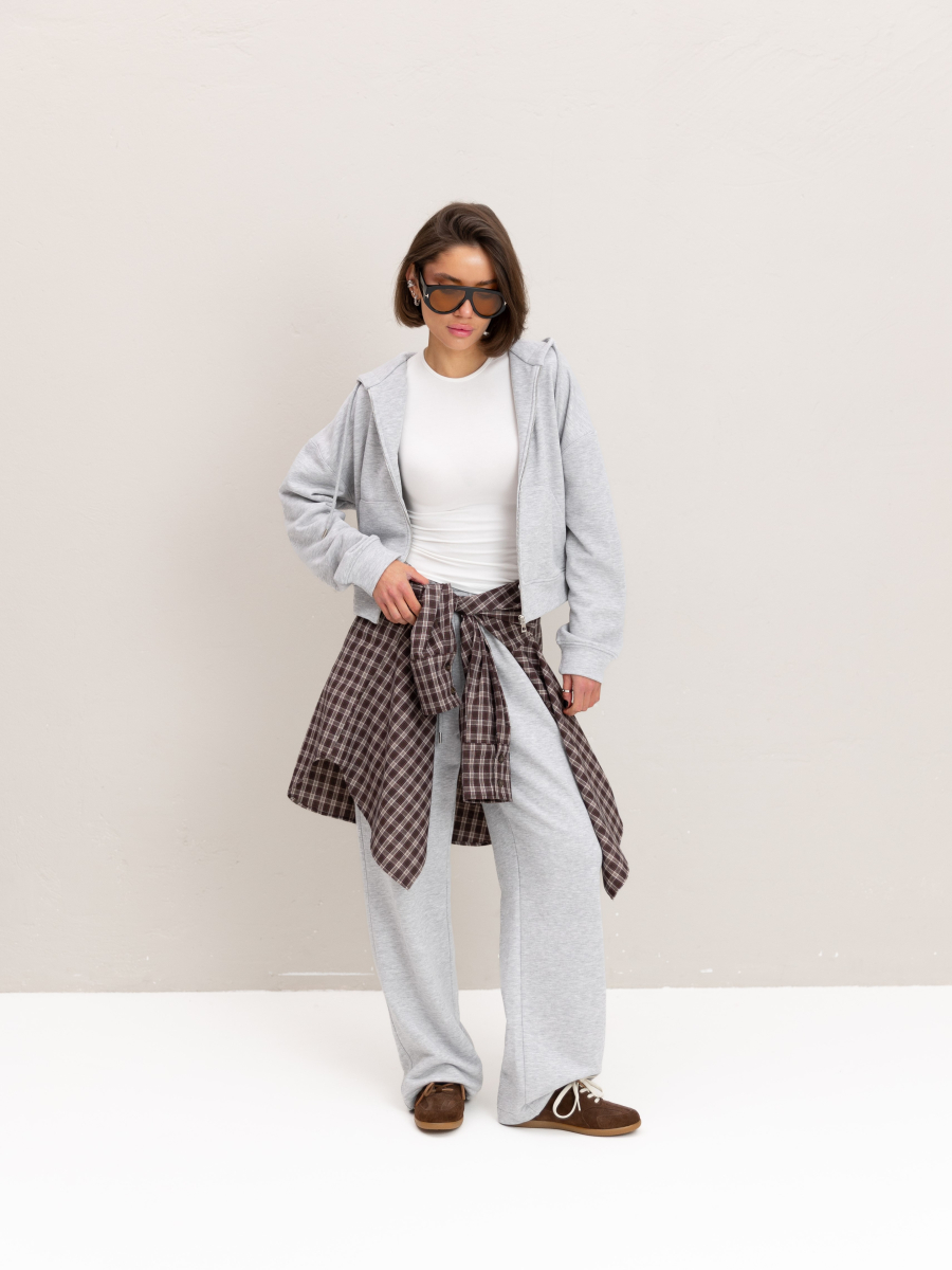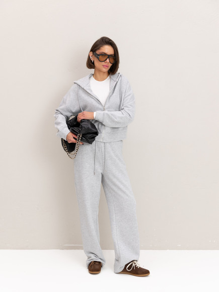 Жіночий костюм у повсякденному стилі - ідеальний баланс комфорту та трендовості. Худі з капюшоном доповнене шнурками. Прямі штани з затяжками можна трансформувати: залишити як прямі штани або стягнути затяжки та створити ефект джогерів.