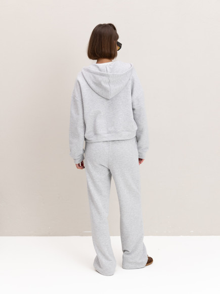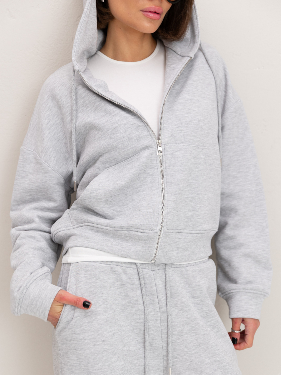 Жіночий костюм у повсякденному стилі - ідеальний баланс комфорту та трендовості. Худі з капюшоном доповнене шнурками. Прямі штани з затяжками можна трансформувати: залишити як прямі штани або стягнути затяжки та створити ефект джогерів.
