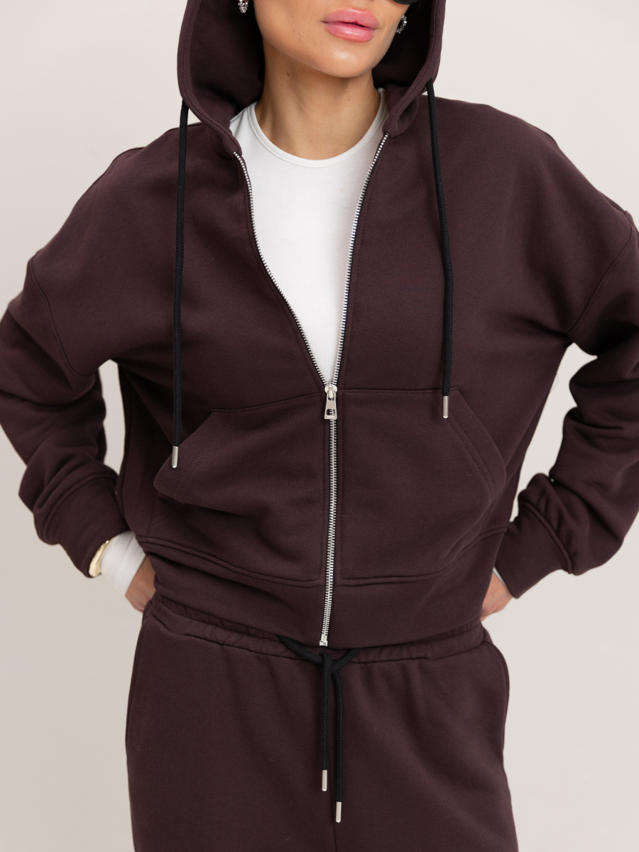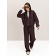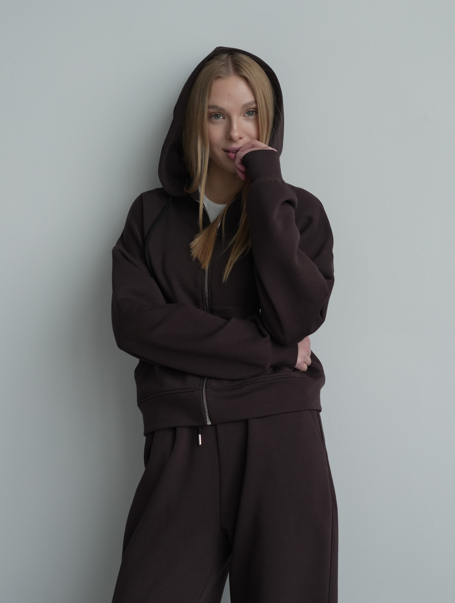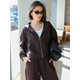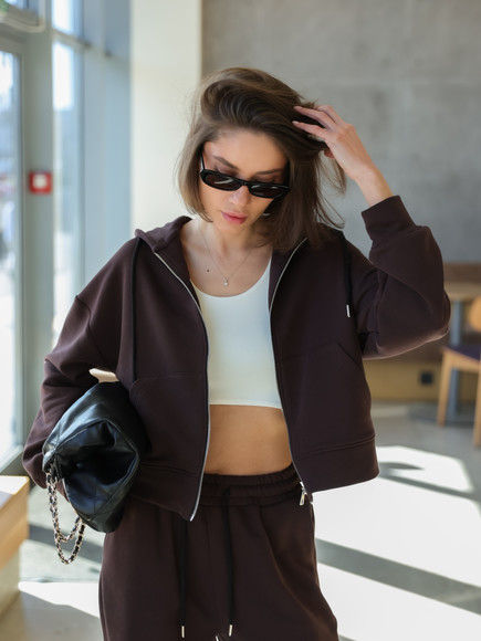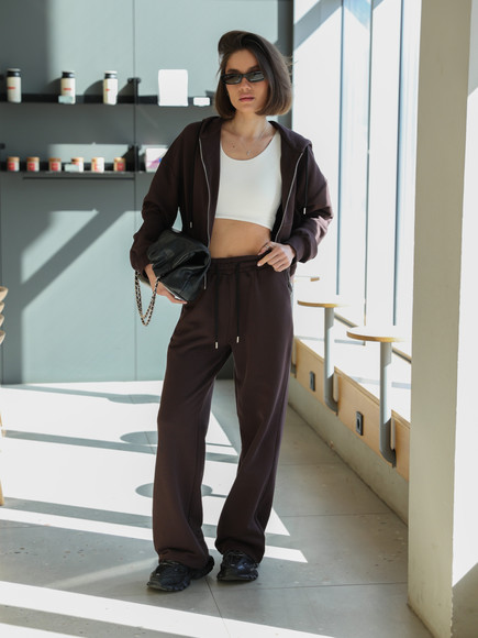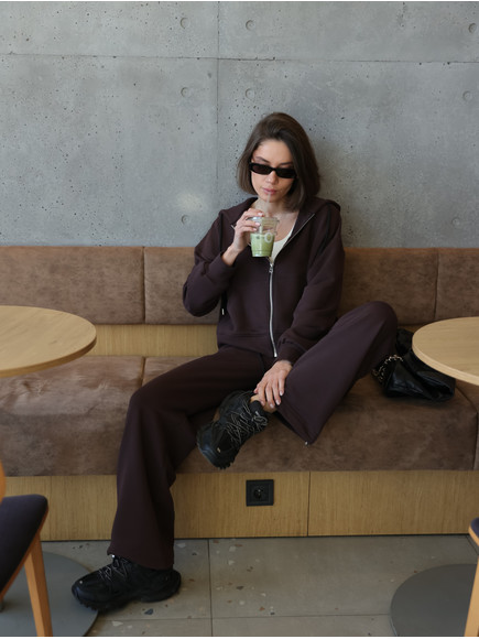 Жіночий костюм у повсякденному стилі - ідеальний баланс комфорту та трендовості. Худі з капюшоном доповнене шнурками. Прямі штани з затяжками можна трансформувати: залишити як прямі штани або стягнути затяжки та створити ефект джогерів.