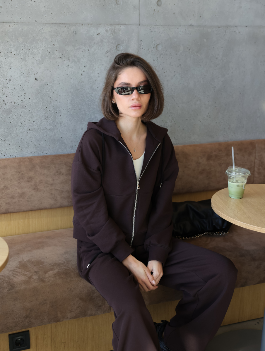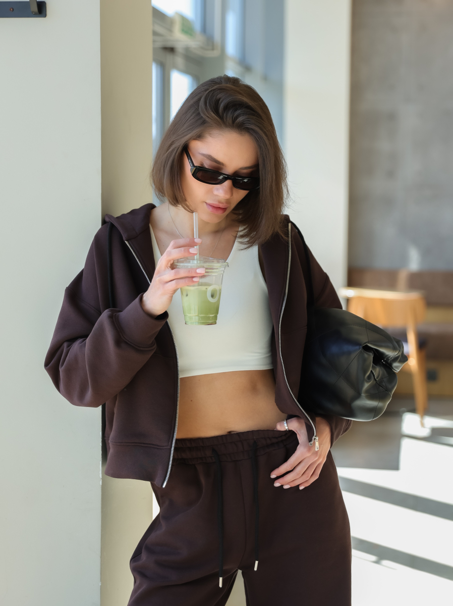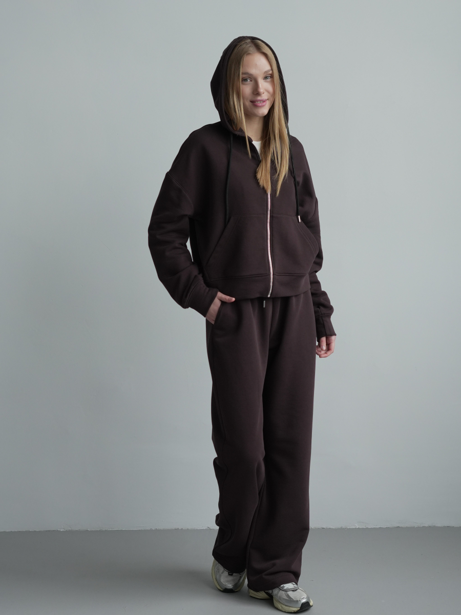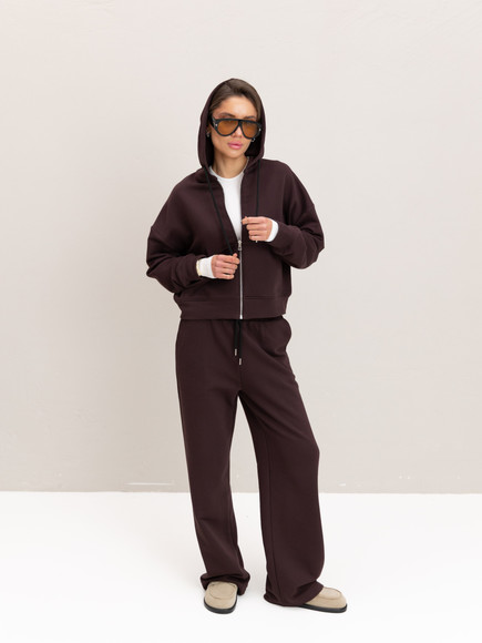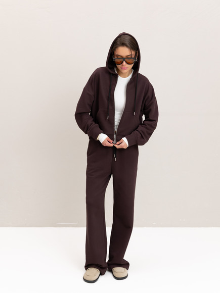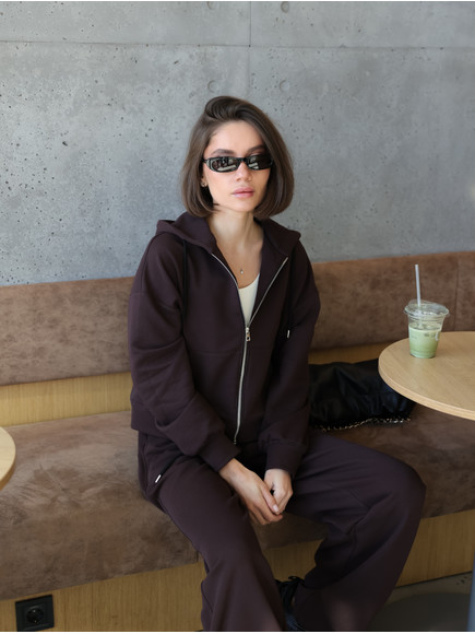 Жіночий костюм у повсякденному стилі - ідеальний баланс комфорту та трендовості. Худі з капюшоном доповнене шнурками. Прямі штани з затяжками можна трансформувати: залишити як прямі штани або стягнути затяжки та створити ефект джогерів.