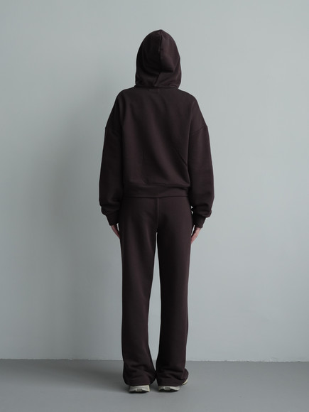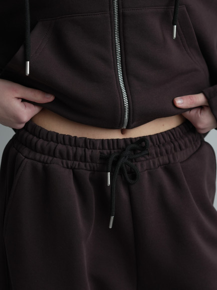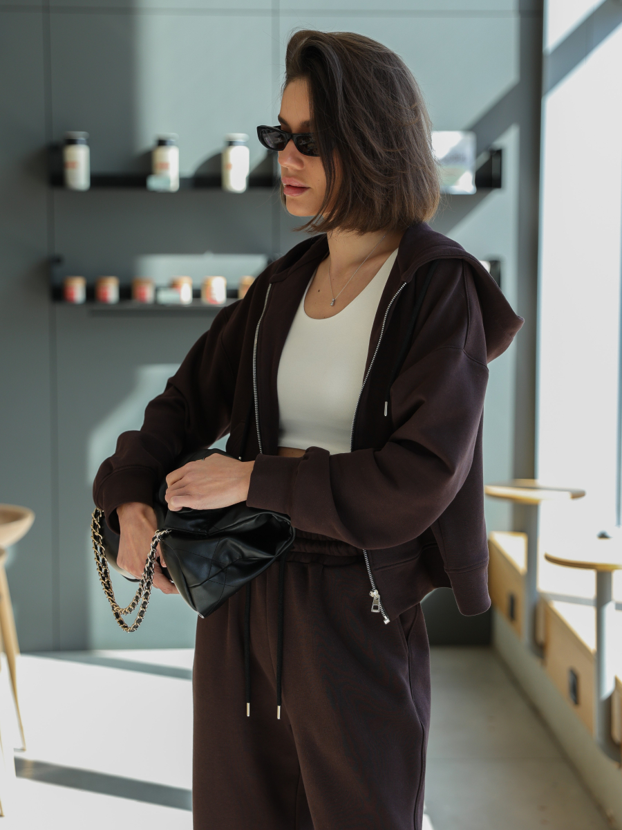 Жіночий костюм у повсякденному стилі - ідеальний баланс комфорту та трендовості. Худі з капюшоном доповнене шнурками. Прямі штани з затяжками можна трансформувати: залишити як прямі штани або стягнути затяжки та створити ефект джогерів.