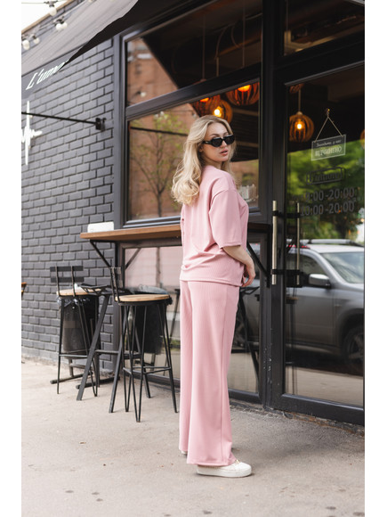 Повсякденний костюм "Кежуал" - футболка вільного крою та штани палаццо. Виконаний з м‘якого «дихаючого» трикотажного матеріалу, який чудово тримає колір та форму. Костюм ніжний до тіла та ідеально підходить на літню пору року. Ще однією перевагою даного костюму є те, що він не мнеться під час носки, і ви завжди будете виглядати ідеально. Футболка вільного крою зі спущеним плечем. Подовжена, не прилягає до тіла , що забезпечує комфорт та свободу руху. Штани «палаццо» високої посадки ідеально комбінуються з будь яким взуттям.