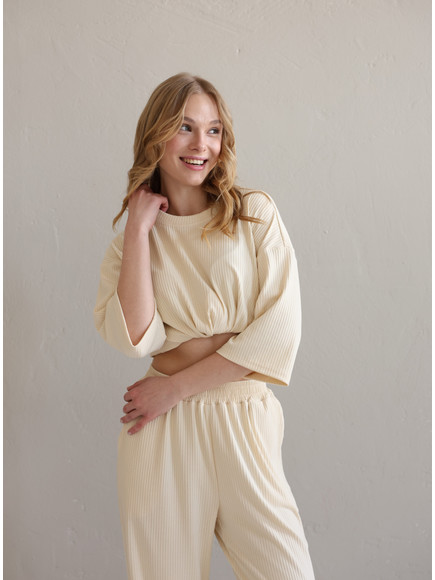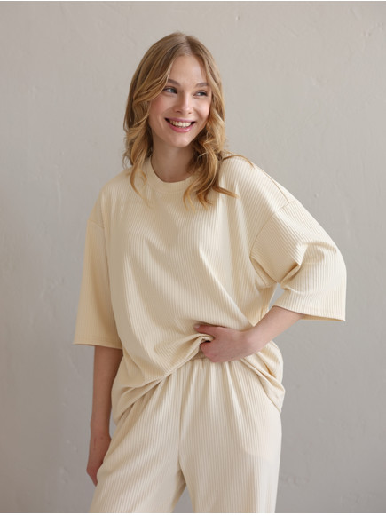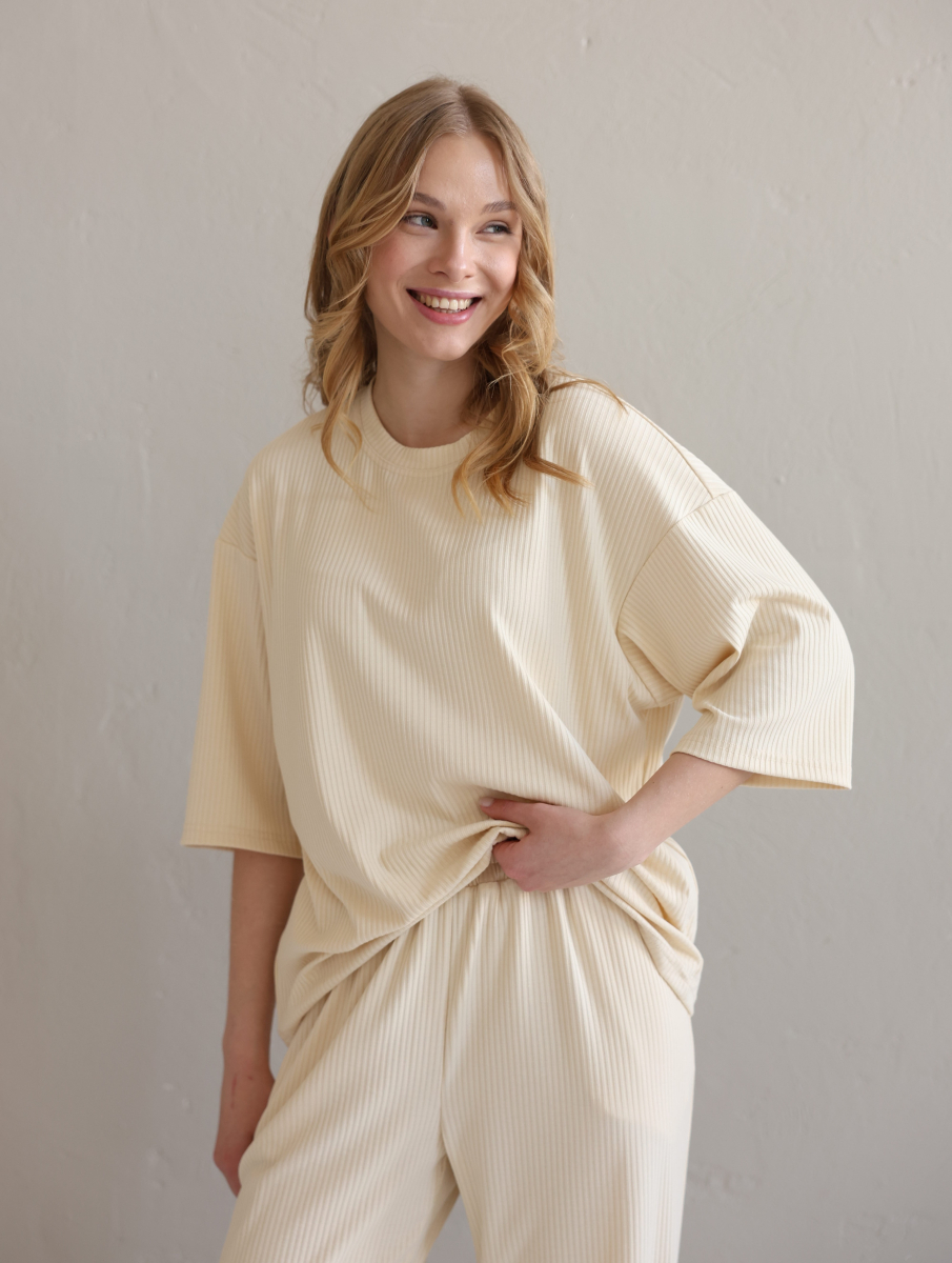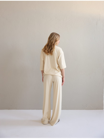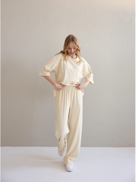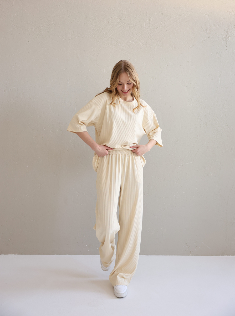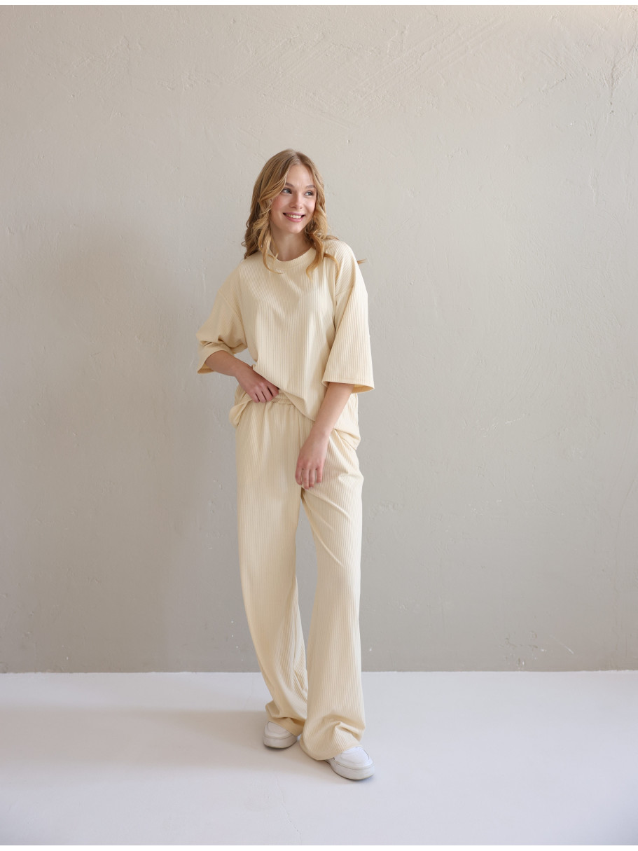 Жіночий костюм "Кежуал" футболка вільного крою та палаццо з рубчик-мустанг, св.бєж
