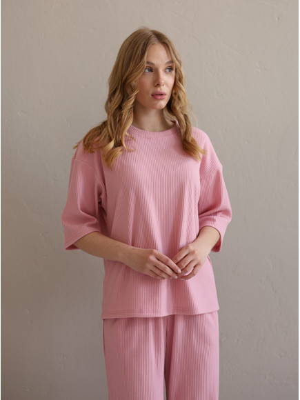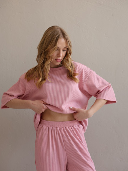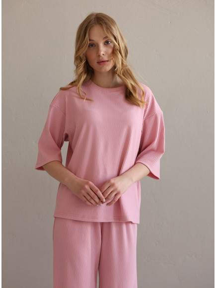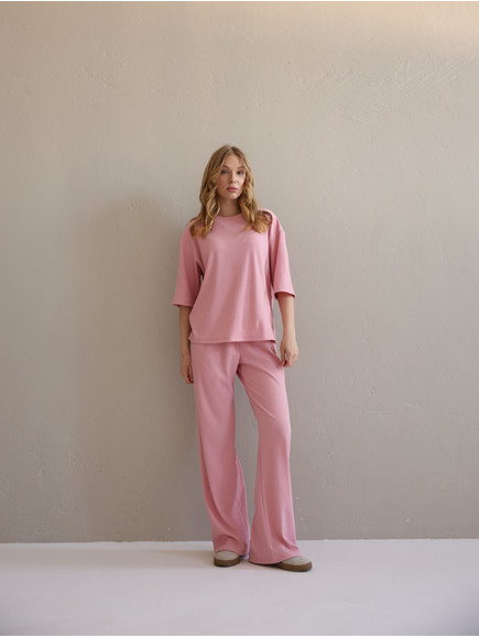 Жіночий костюм "Кежуал" футболка вільного крою та палаццо з рубчик-мустанг, рожевий