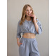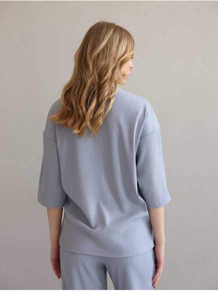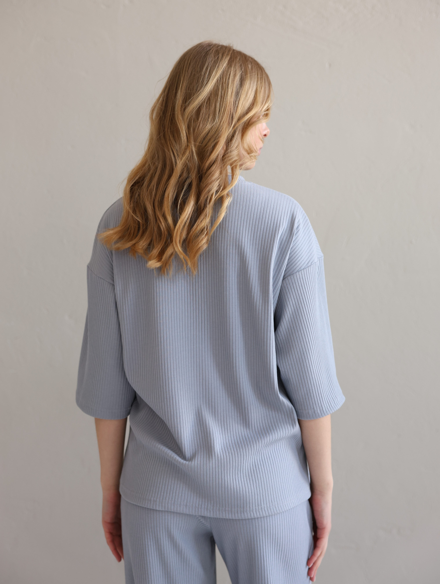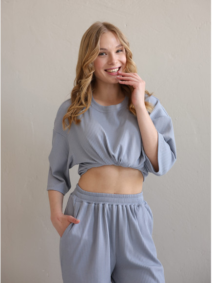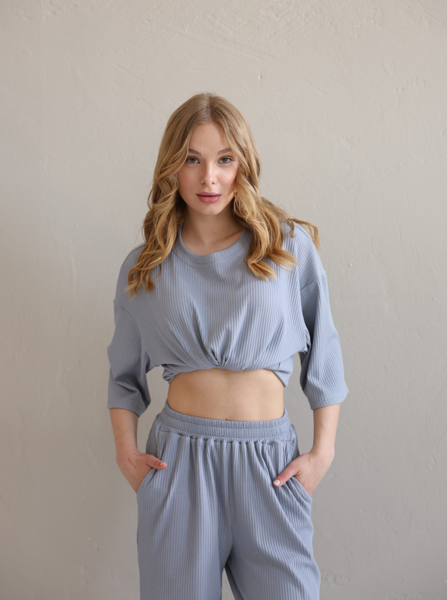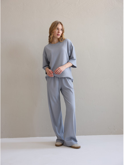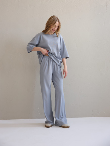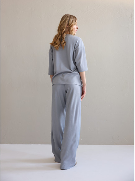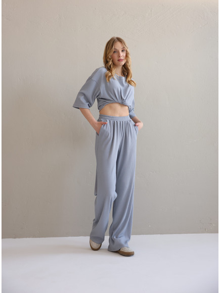 Повсякденний костюм "Кежуал" - футболка вільного крою та штани палаццо. Виконаний з м‘якого «дихаючого» трикотажного матеріалу, який чудово тримає колір та форму. Костюм ніжний до тіла та ідеально підходить на літню пору року. Ще однією перевагою даного костюму є те, що він не мнеться під час носки, і ви завжди будете виглядати ідеально. Футболка вільного крою зі спущеним плечем. Подовжена, не прилягає до тіла , що забезпечує комфорт та свободу руху. Штани «палаццо» високої посадки ідеально комбінуються з будь яким взуттям.
