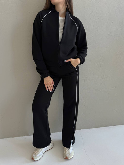 Вільний бомбер забезпечує легкість і зручність, а штани з розрізами додають динамічності образу. Контрастний кант візуально підкреслює силует, роблячи комплект ще більш виразним.