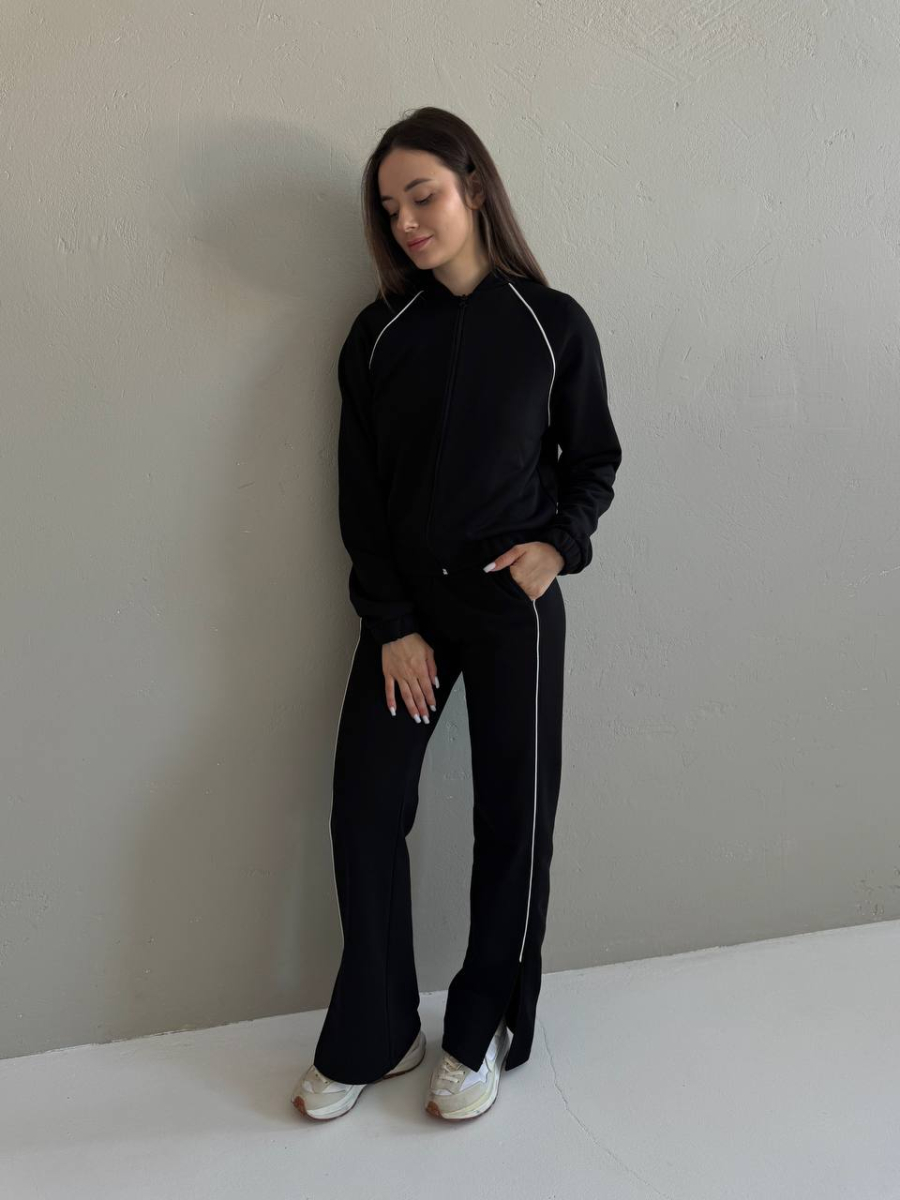 Вільний бомбер забезпечує легкість і зручність, а штани з розрізами додають динамічності образу. Контрастний кант візуально підкреслює силует, роблячи комплект ще більш виразним.
