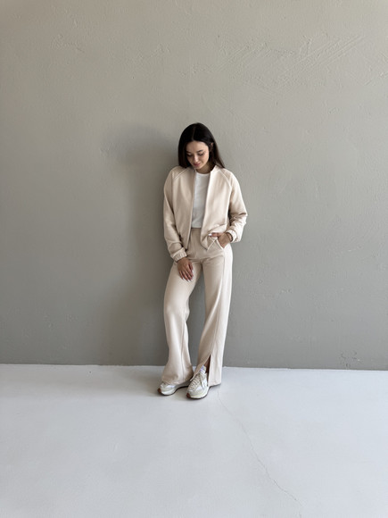 Вільний бомбер забезпечує легкість і зручність, а штани з розрізами додають динамічності образу. Контрастний кант візуально підкреслює силует, роблячи комплект ще більш виразним.