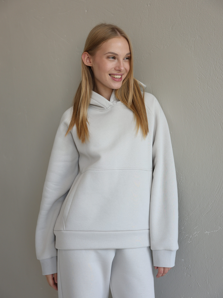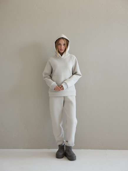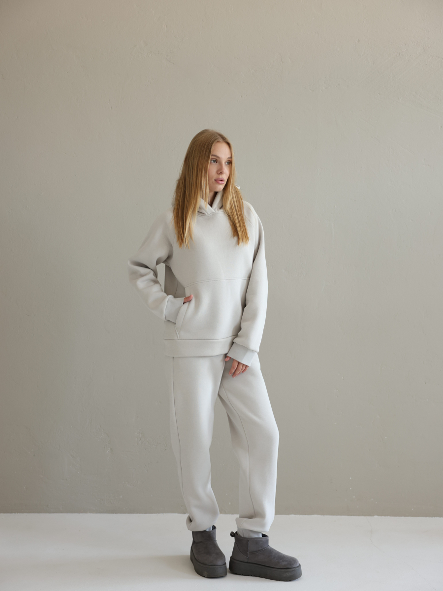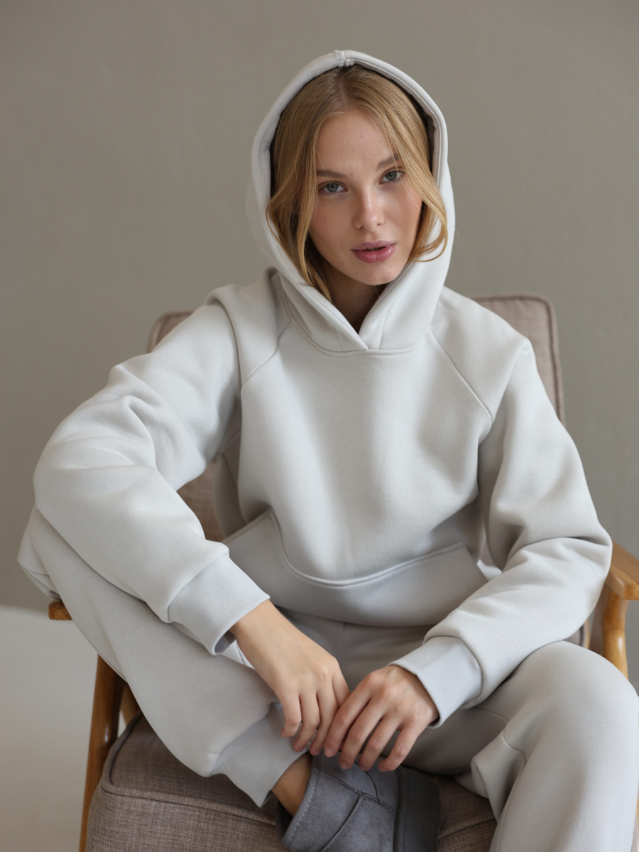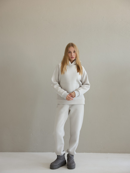 Худі вільного крою з капюшоном та місткою кишенею-«кенгуру» дарує комфорт і тепло у прохолодну погоду. Джогери з високою посадкою та манжетами підкреслюють сучасний силует і легко поєднуються з будь-яким взуттям – від кросівок до чобіт.