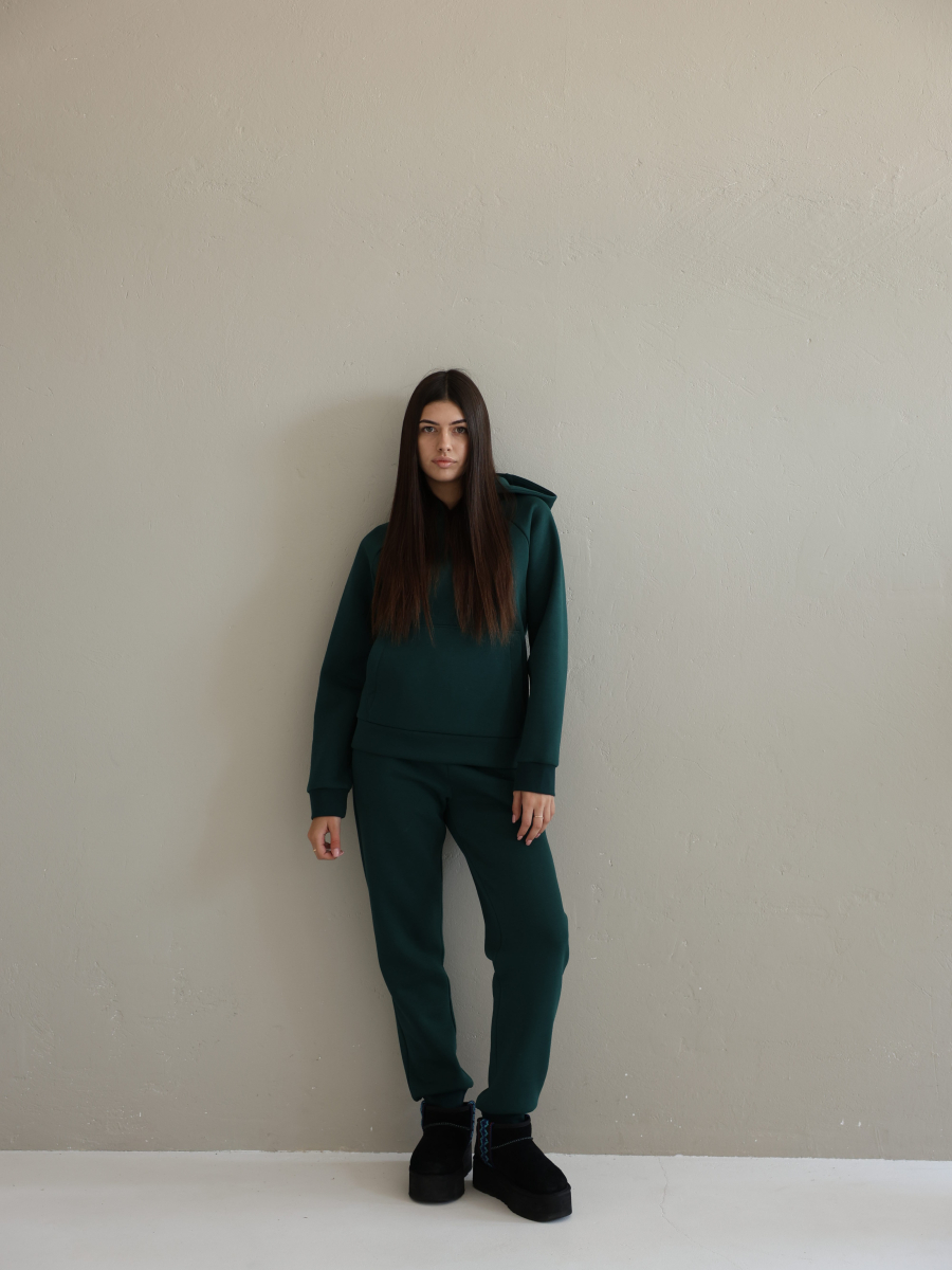 Худі вільного крою з капюшоном та місткою кишенею-«кенгуру» дарує комфорт і тепло у прохолодну погоду. Джогери з високою посадкою та манжетами підкреслюють сучасний силует і легко поєднуються з будь-яким взуттям – від кросівок до чобіт.