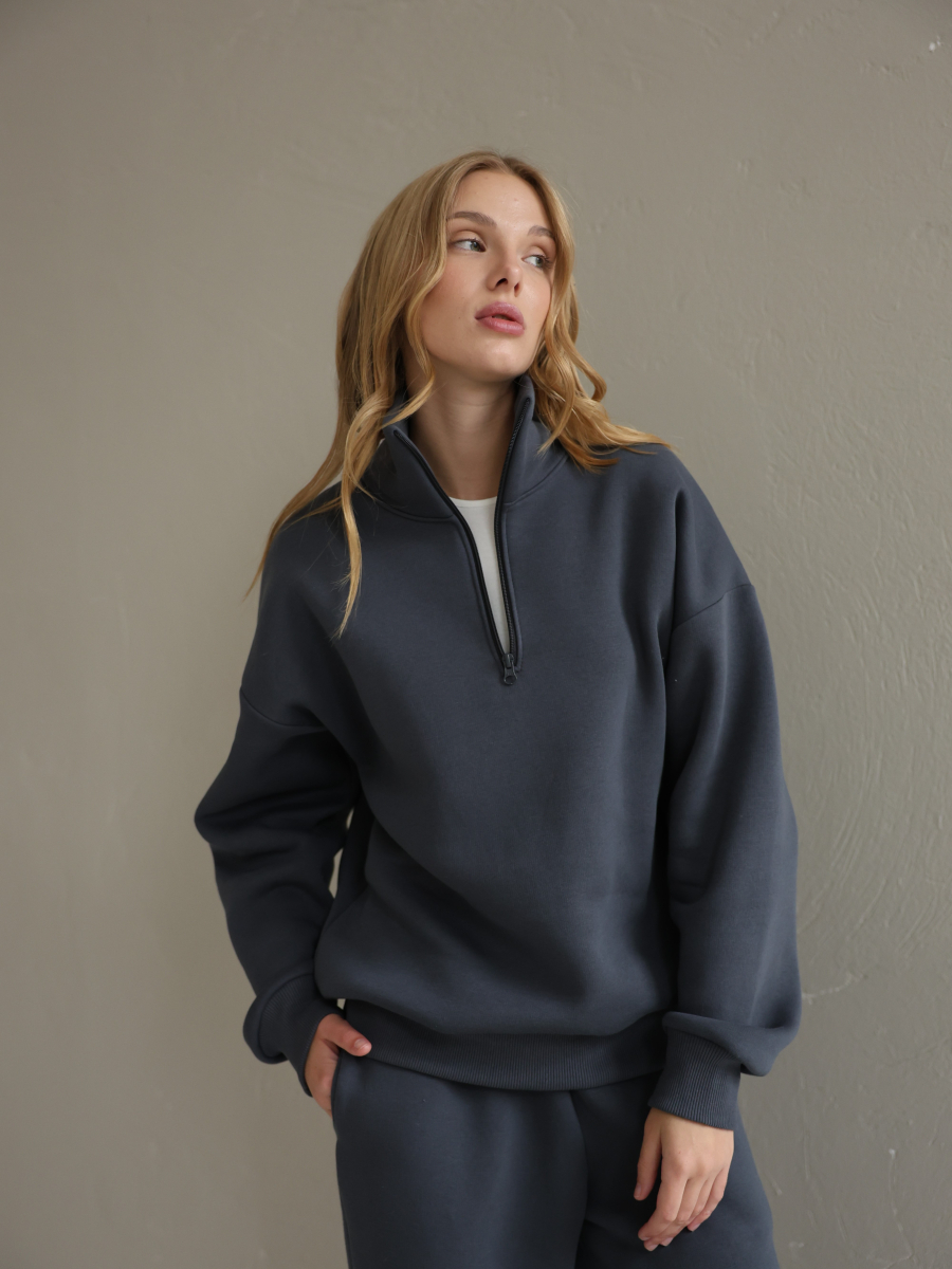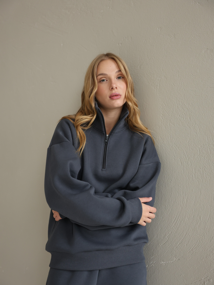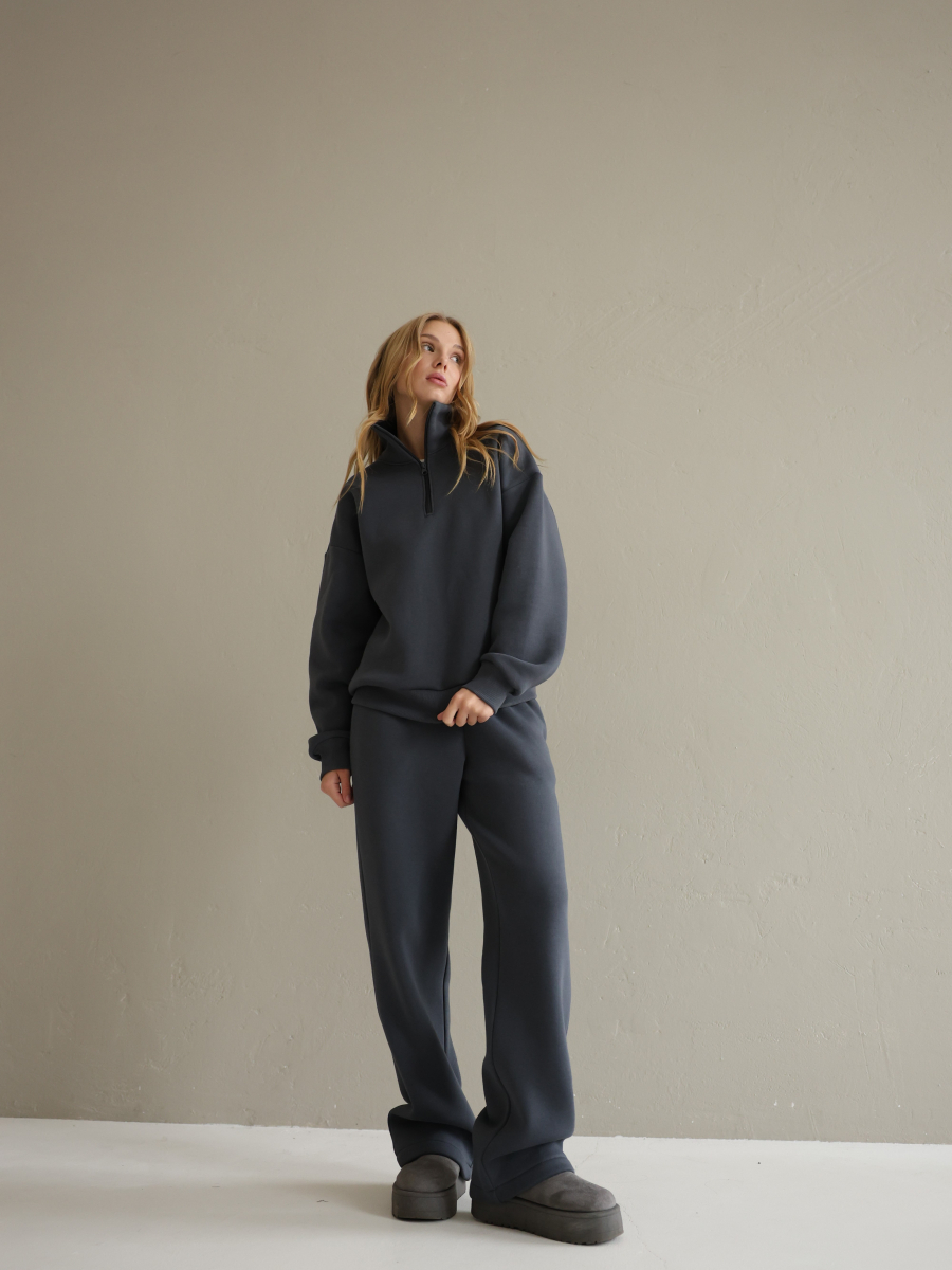 Жіночий костюм Flow — стильне поєднання тепла, комфорту та сучасного крою. Джемпер оверсайз зі спущеним плечем, блискавкою та стійкою додає образу трендовості та зручності. Прямі штани створюють охайний силует і забезпечують свободу рухів.