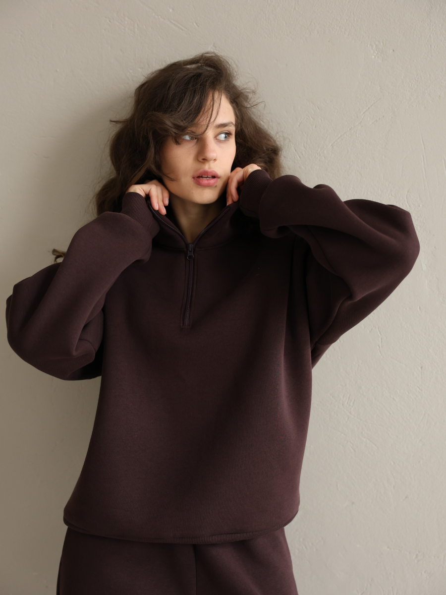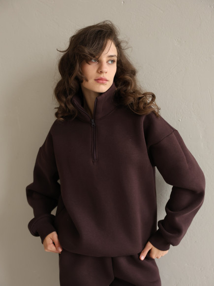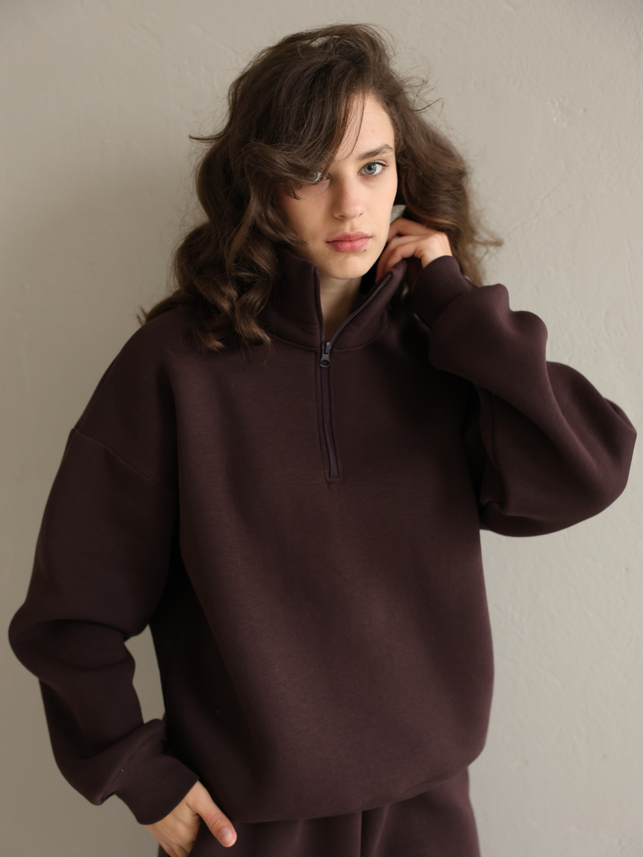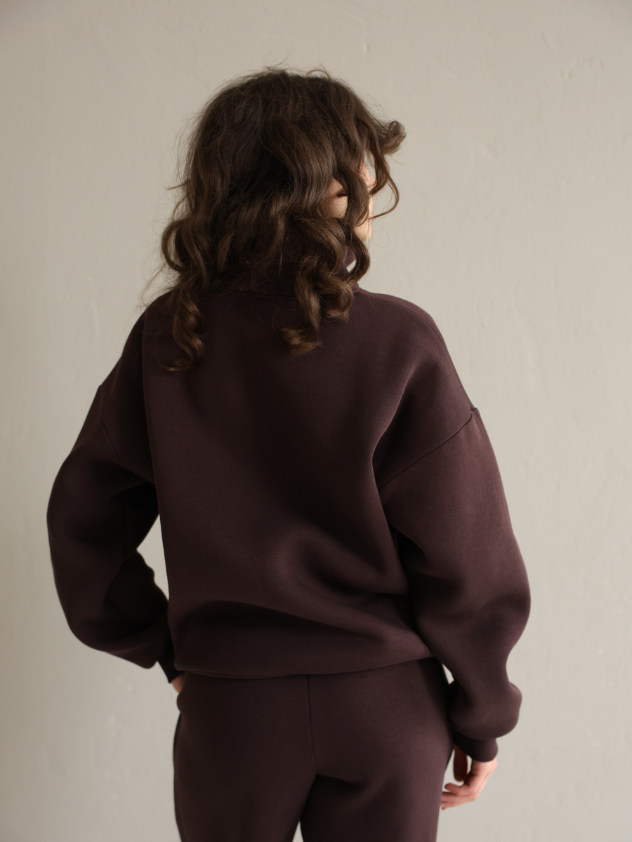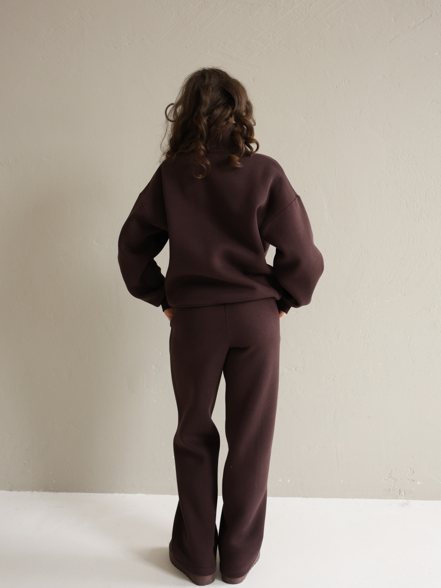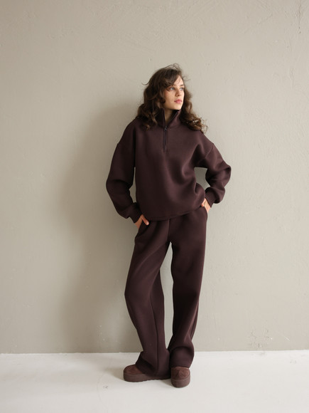 Жіночий костюм Flow — стильне поєднання тепла, комфорту та сучасного крою. Джемпер оверсайз зі спущеним плечем, блискавкою та стійкою додає образу трендовості та зручності. Прямі штани створюють охайний силует і забезпечують свободу рухів.