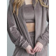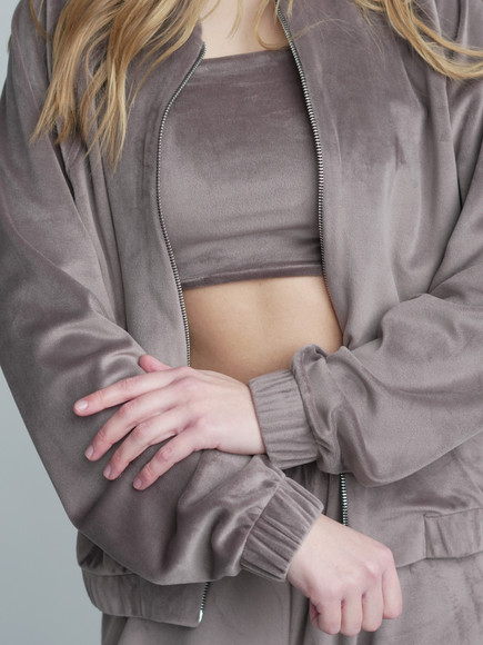 Класичний бомбер має лаконічний крій, що м’яко підкреслює силует і додає образу структурованості. Завдяки продуманій посадці він виглядає стильно як у застібнутому вигляді, так і накинутим поверх топа. М’який велюр створює відчуття затишку та водночас додає вишуканості.