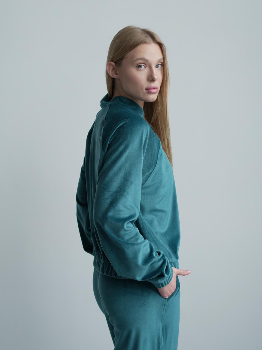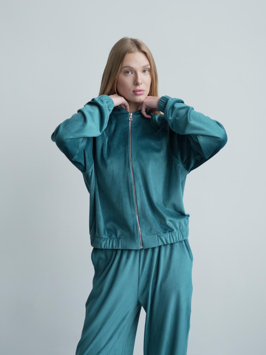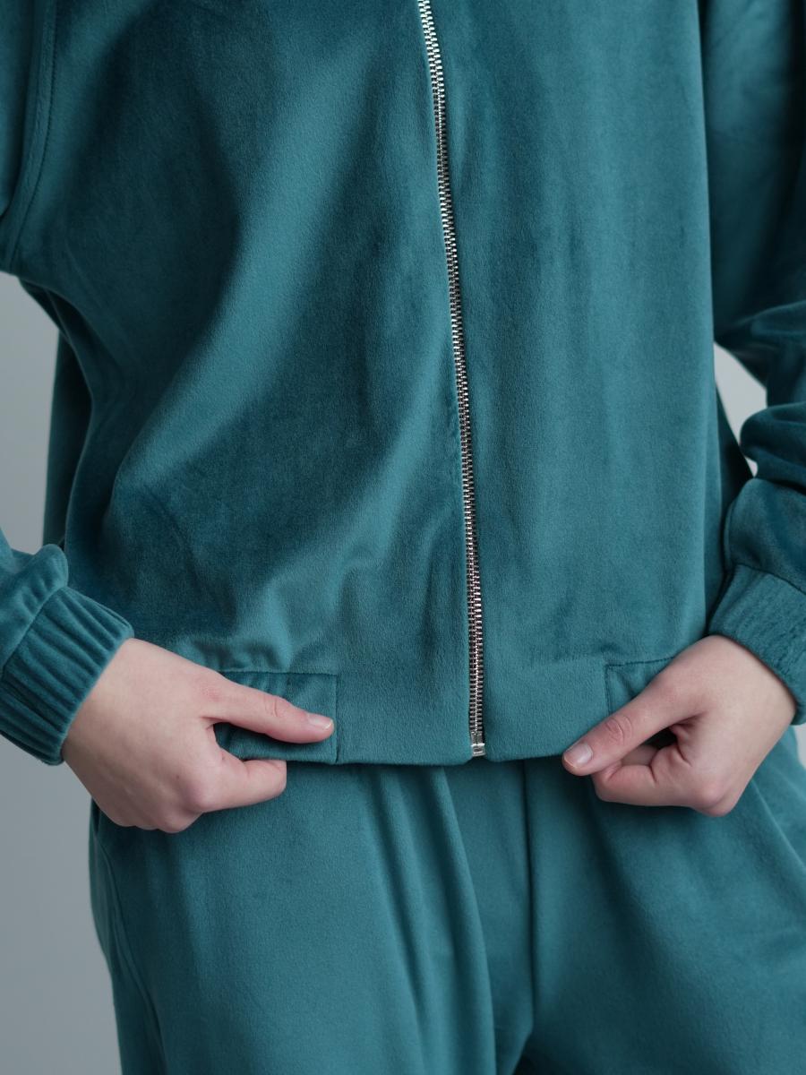 Класичний бомбер має лаконічний крій, що м’яко підкреслює силует і додає образу структурованості. Завдяки продуманій посадці він виглядає стильно як у застібнутому вигляді, так і накинутим поверх топа. М’який велюр створює відчуття затишку та водночас додає вишуканості.