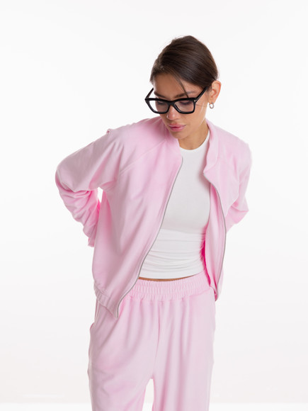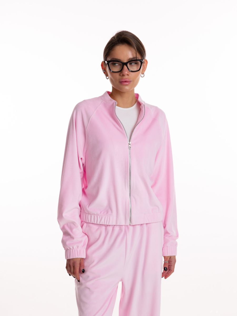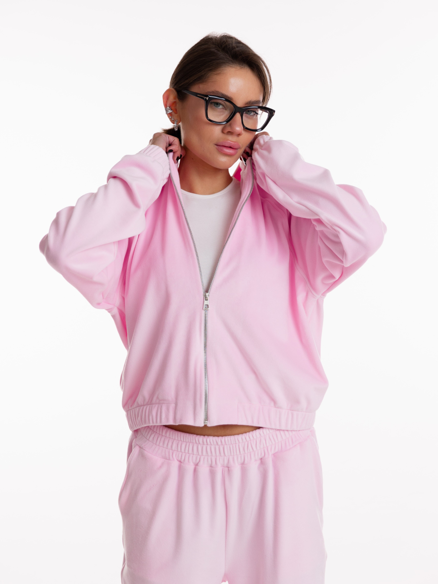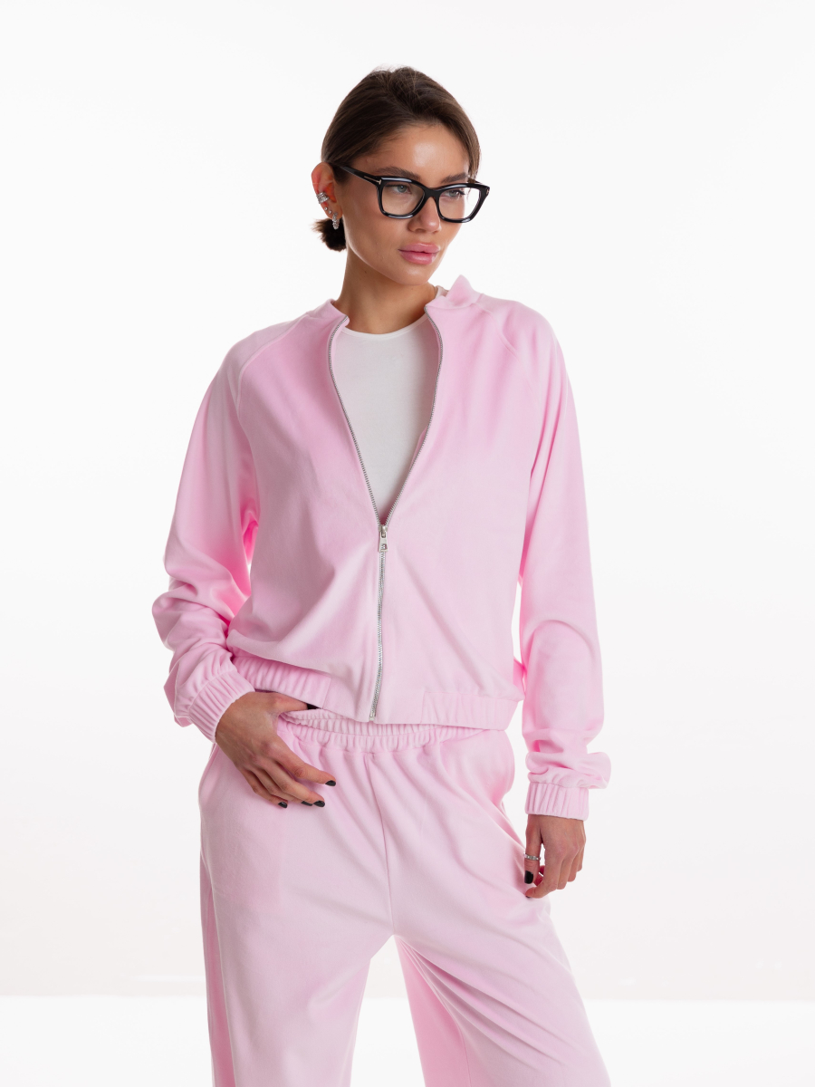 Класичний бомбер має лаконічний крій, що м’яко підкреслює силует і додає образу структурованості. Завдяки продуманій посадці він виглядає стильно як у застібнутому вигляді, так і накинутим поверх топа. М’який велюр створює відчуття затишку та водночас додає вишуканості.