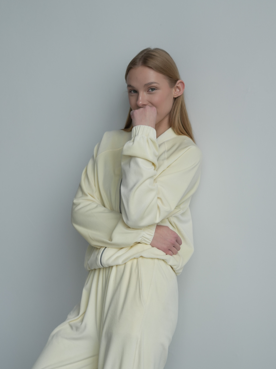 Класичний бомбер має лаконічний крій, що м’яко підкреслює силует і додає образу структурованості. Завдяки продуманій посадці він виглядає стильно як у застібнутому вигляді, так і накинутим поверх топа. М’який велюр створює відчуття затишку та водночас додає вишуканості.