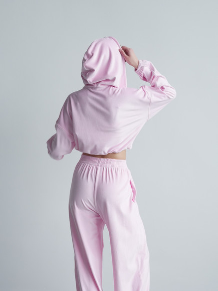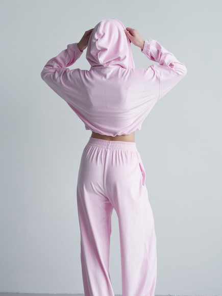 Вкорочене худі на затяжках підкреслює талію та додає образу сучасного характеру. Регульований низ дозволяє змінювати силует - від більш вільного до зібраного, створюючи різні настрої в одному комплекті.