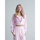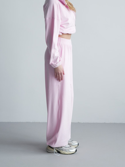 Штани-палаццо мають затяжки внизу, завдяки яким можна регулювати ширину: носити їх як класичні палаццо з вільним, струмливим кроєм або трансформувати в стильні джогери. Така деталь робить костюм максимально практичним і функціональним.