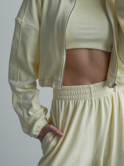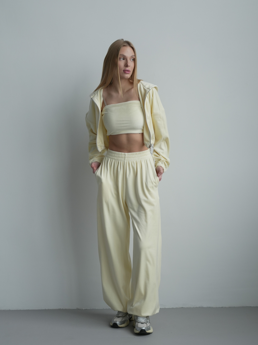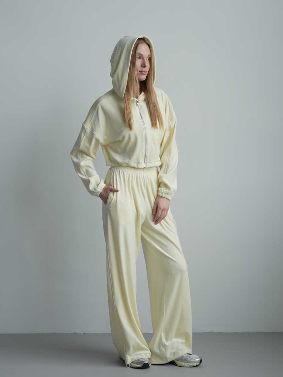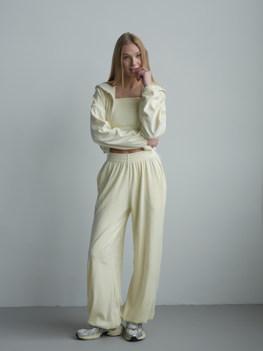 Жіночий велюровий костюм Lola зіп-худі з широкими палаццо на затяжках , вершкове масло