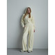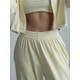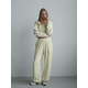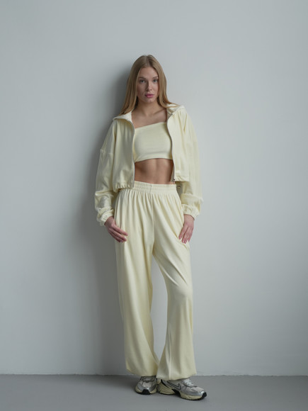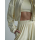 Штани-палаццо мають затяжки внизу, завдяки яким можна регулювати ширину: носити їх як класичні палаццо з вільним, струмливим кроєм або трансформувати в стильні джогери. Така деталь робить костюм максимально практичним і функціональним.