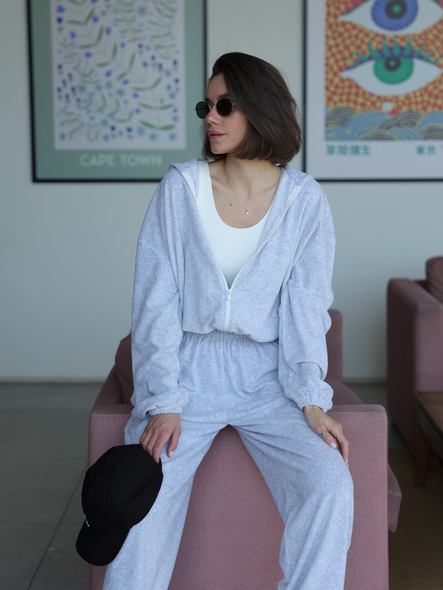 Універсальний комплект, що поєднує комфорт та сучасний дизайн. М’який велюр на бавовняній основі приємний до тіла, дихає та дарує відчуття затишку в будь-яку пору року.