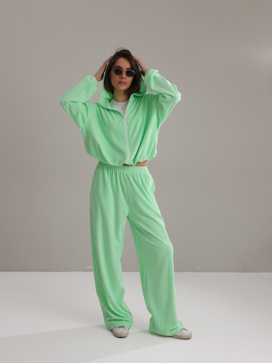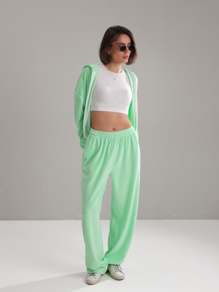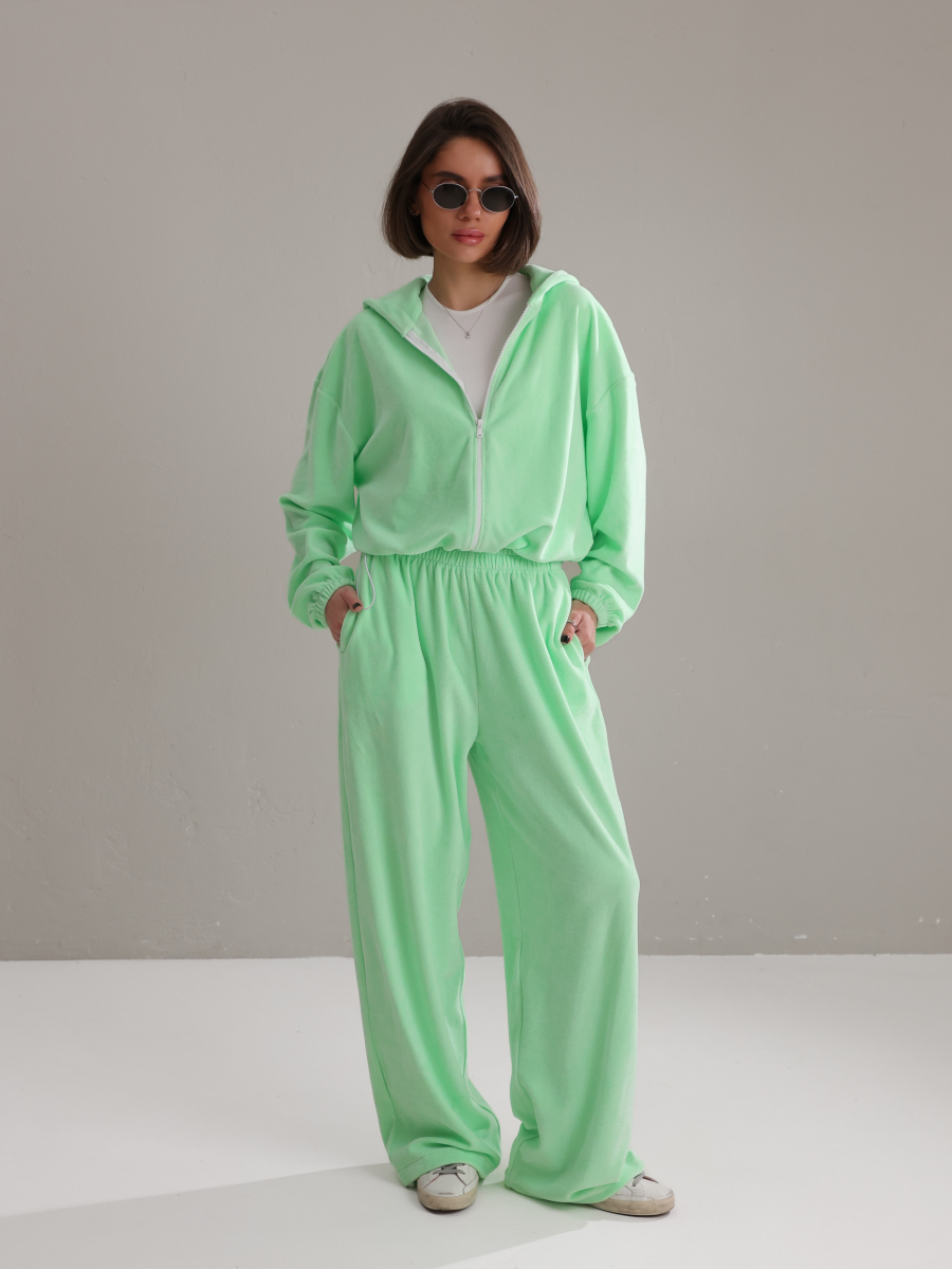 Універсальний комплект, що поєднує комфорт та сучасний дизайн. М’який велюр на бавовняній основі приємний до тіла, дихає та дарує відчуття затишку в будь-яку пору року.