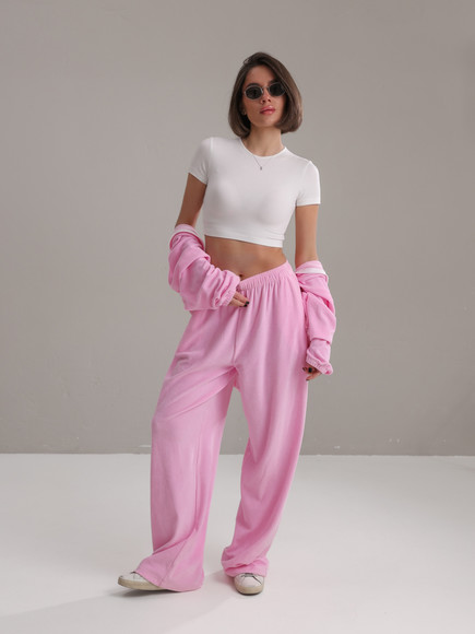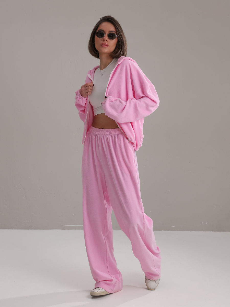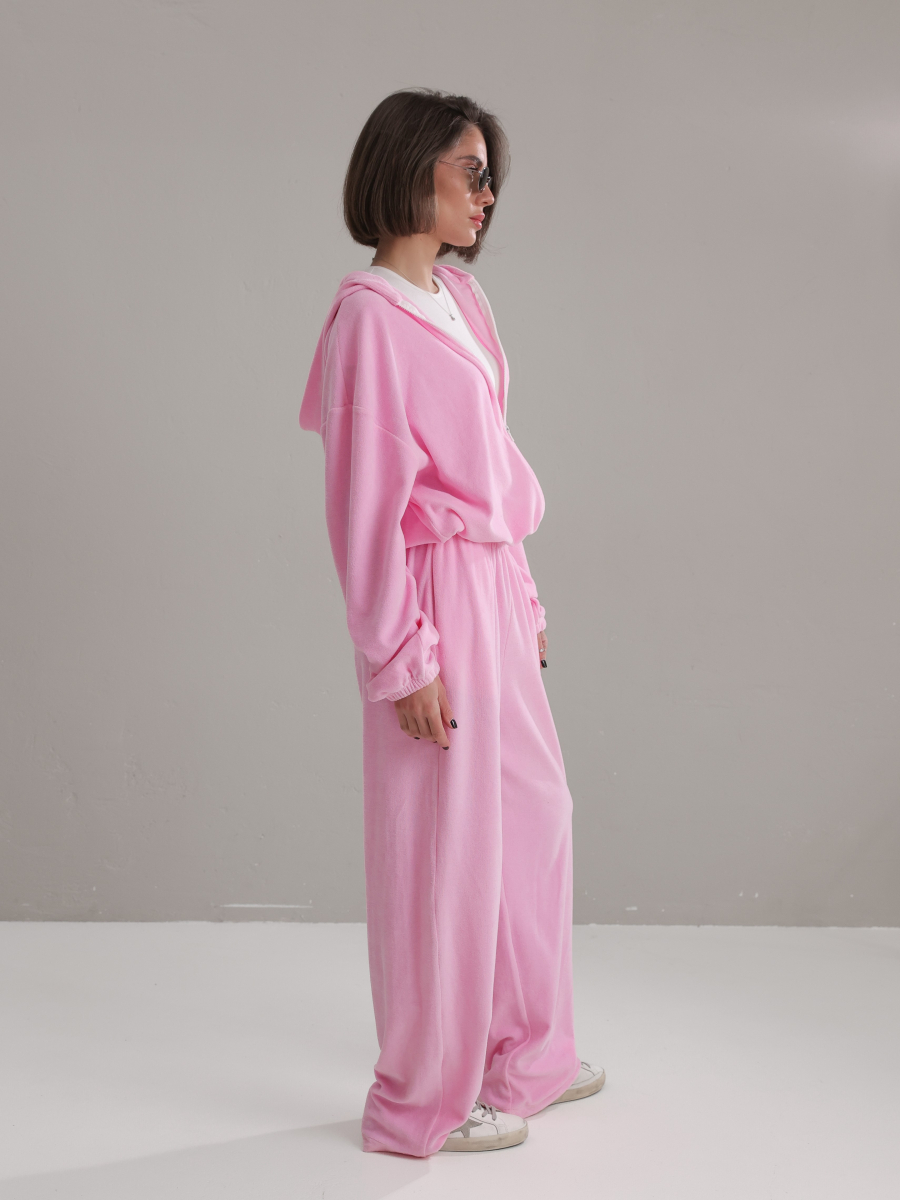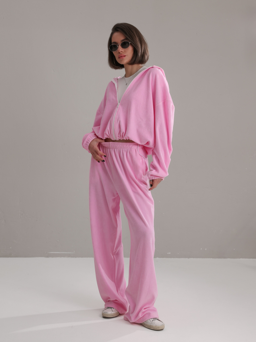 Універсальний комплект, що поєднує комфорт та сучасний дизайн. М’який велюр на бавовняній основі приємний до тіла, дихає та дарує відчуття затишку в будь-яку пору року.