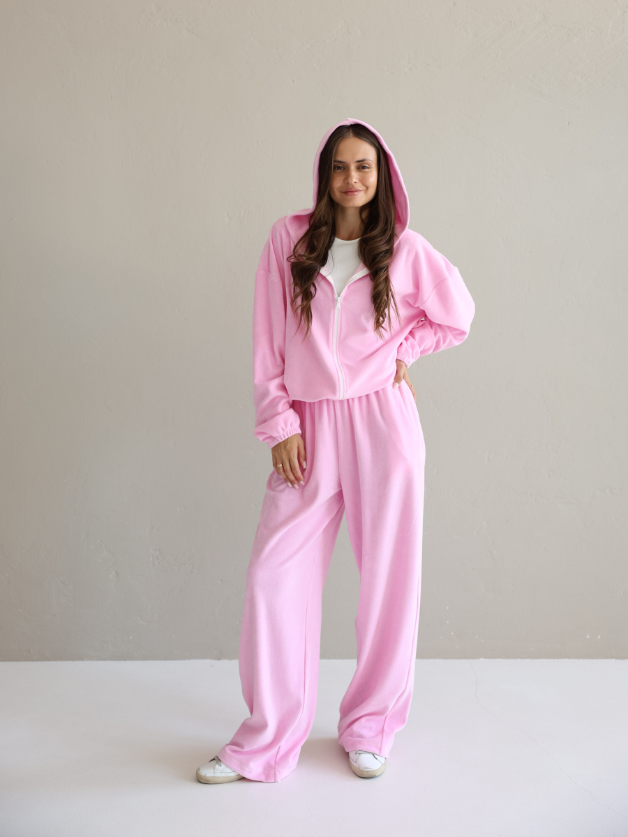Універсальний комплект, що поєднує комфорт та сучасний дизайн. М’який велюр на бавовняній основі приємний до тіла, дихає та дарує відчуття затишку в будь-яку пору року.