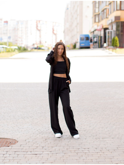 Легкий жіночий костюм Fly - це сорочка та штани палаццо, які виконані з реону. Подовжена сорочка на ґудзиках ідеально поєднується з будь-яким топом або майкою. Штани палаццо високої посадки з еластичною резинкою на поясі не перетискають шкіру. Їх можна носити з кросівками, босоніжками, кедами чи підборами. Цей стильний та елегантний костюм підійде на офіційний захід, прогулянку або вечірку.