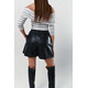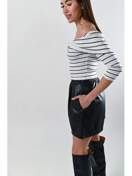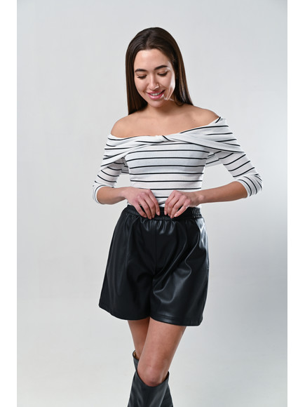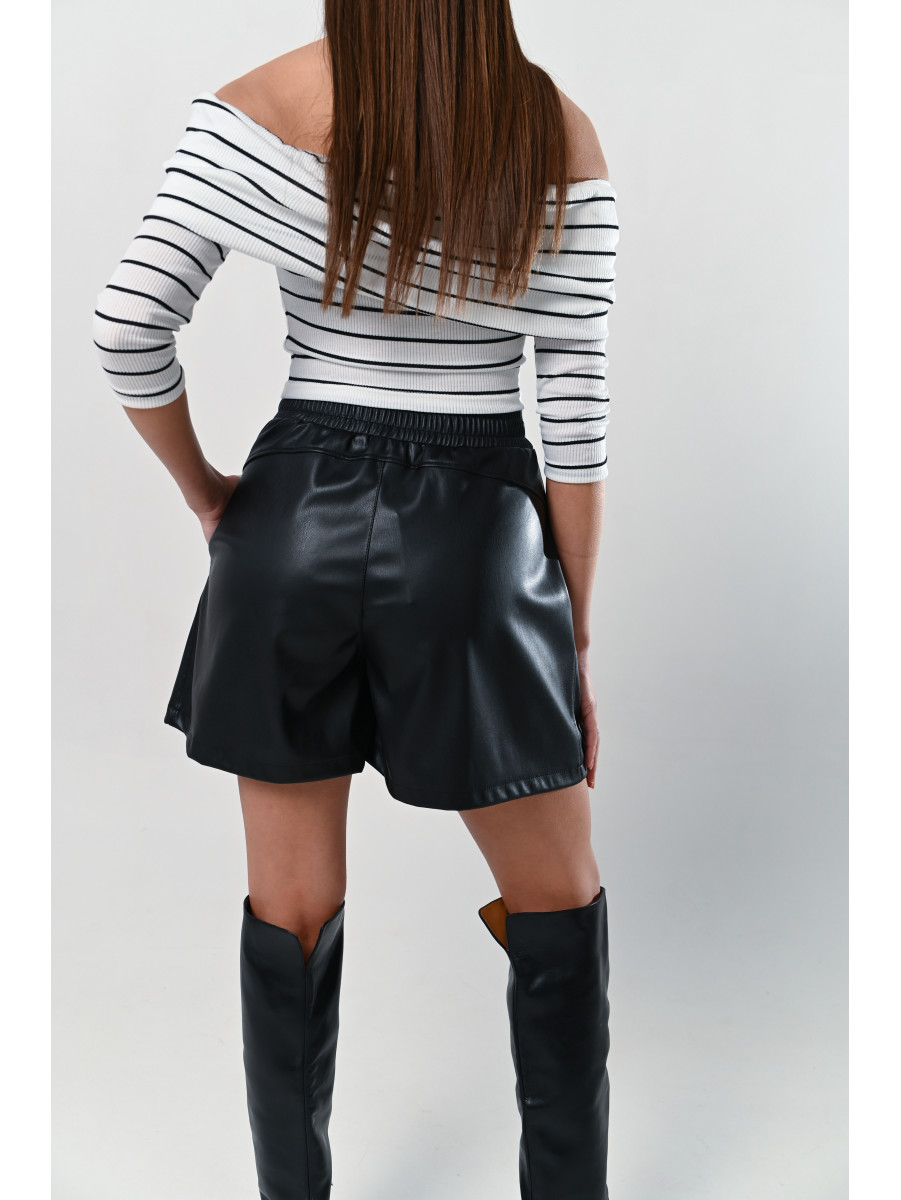 Шорти пошиті з щільної еко-шкіри, яка не просвічується, зручна та приємна до тіла. Зберігає свій зовнішній вигляд після прання, не тріскається та не розтягується. Мають дві кишені збоку та зручну і елестичну резинку в поясі