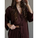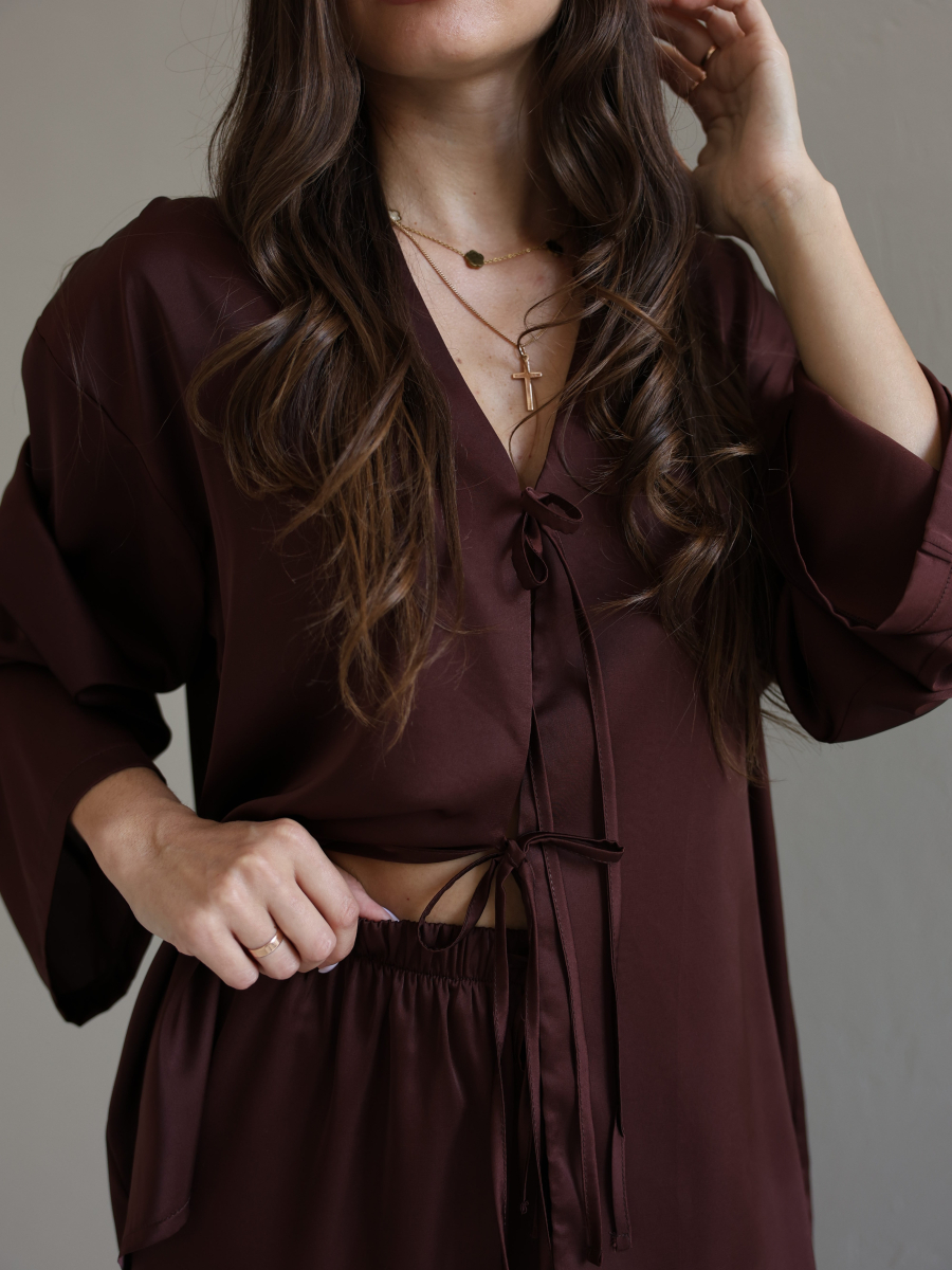 Шовк приємно лягає до тіла, дозволяючи шкірі дихати, а зав’язки на грудях дозволяють регулювати посадку та створювати різні варіанти зав’язування - більш відкрита чи стримана подача.