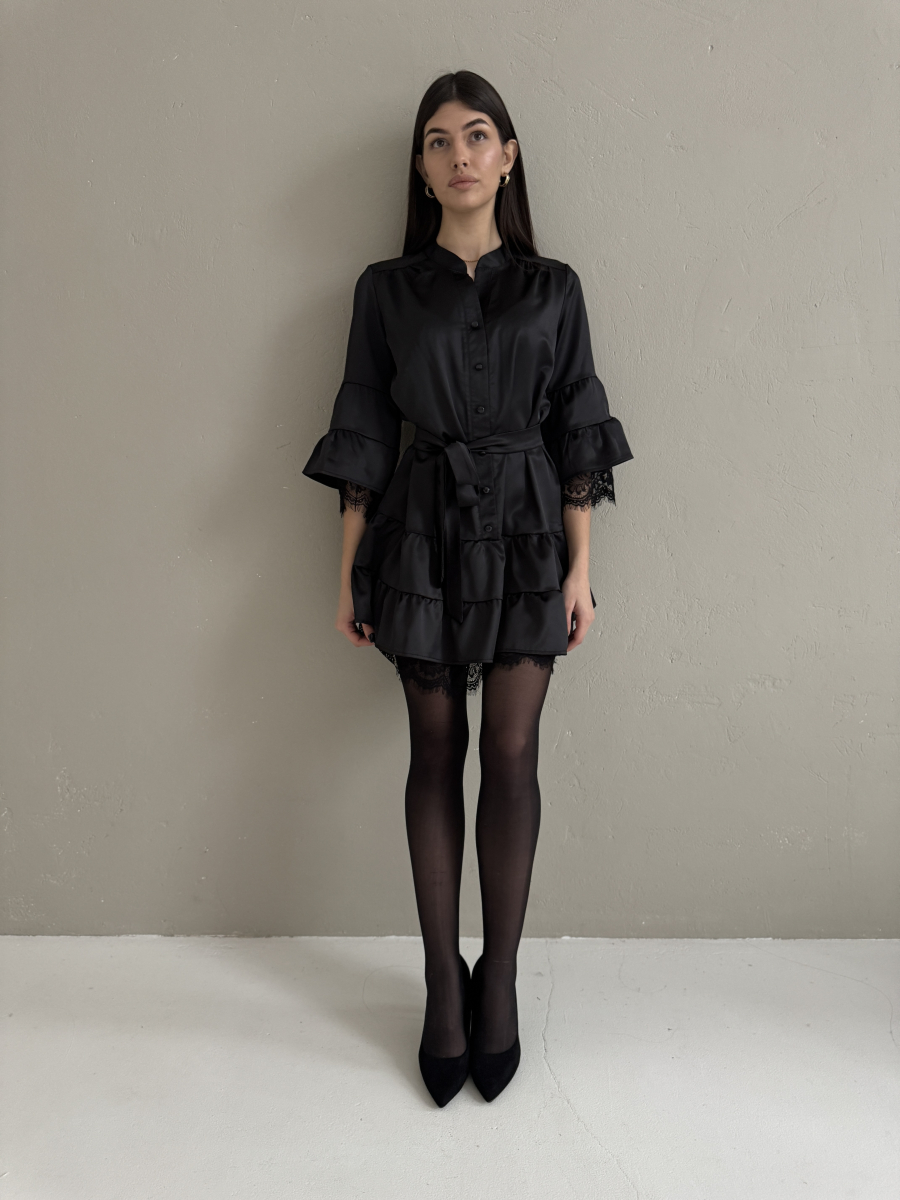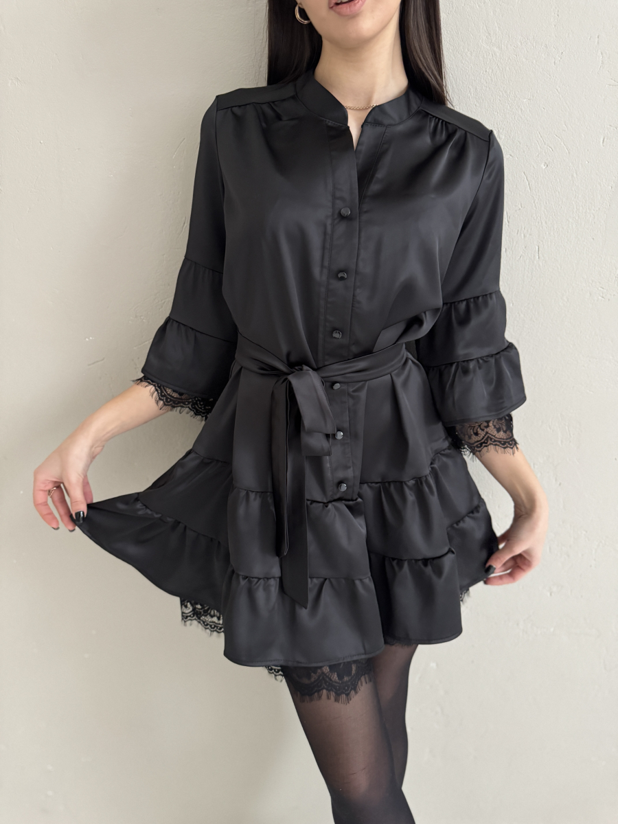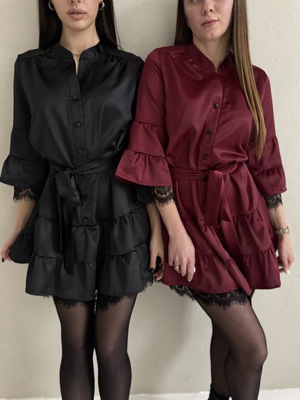 Розкішна міні сукня з атласу із ніжним мереживом - втілення елегантності та жіночності. Легка, струмлива тканина огортає фігуру, створюючи витончений силует, а пояс підкреслює талію, додаючи образу гармонійності. Делікатне мереживо надає сукні особливого шарму, роблячи її ідеальним вибором для романтичних вечорів, урочистих подій чи стильних виходів.