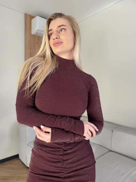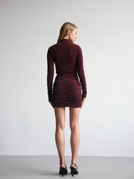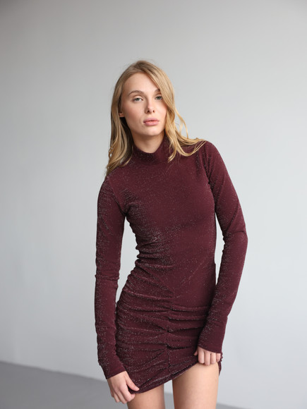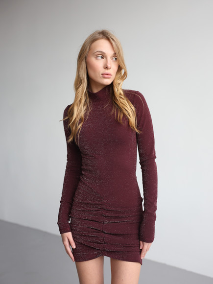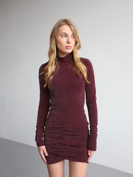 М’яка еластична тканина з делікатним блиском красиво переливається при русі, підкреслюючи силует. Драпірування візуально моделює фігуру, додає жіночності та вигідно акцентує талію й лінії тіла. Довжина міні відкриває ноги, створюючи сміливий і водночас елегантний настрій.