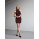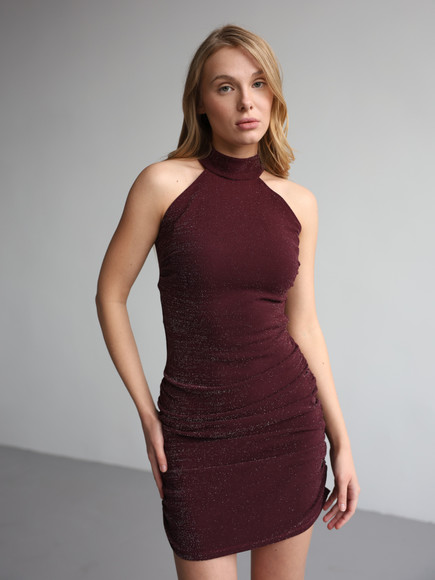 Блискуча еластична тканина м’яко облягає фігуру, красиво переливаючись при кожному русі. Відкриті плечі та лінія ключиць додають образу витонченості й чуттєвості, створюючи акцент без зайвої відвертості.