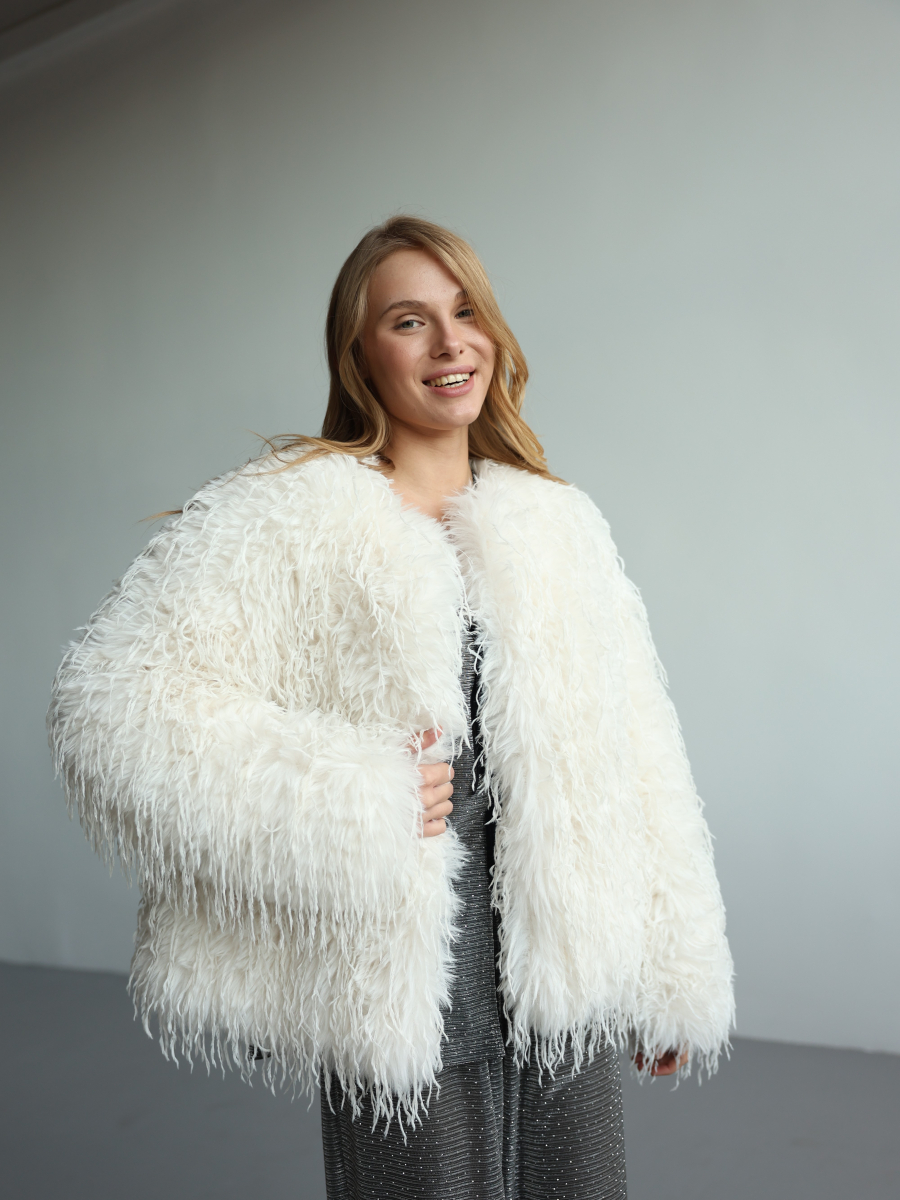 Модель виконана з м’якого еко-хутра «лама», що створює об’ємну фактуру та сучасний силует. Легка, тепла та неймовірно комфортна - ідеальний варіант для щоденних образів і вечірніх виходів.