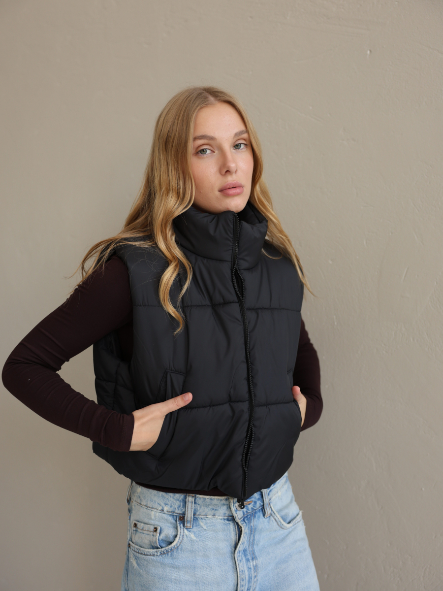 Укорочений теплий жилет з кулісками — зручний і стильний варіант для холодної погоди.
